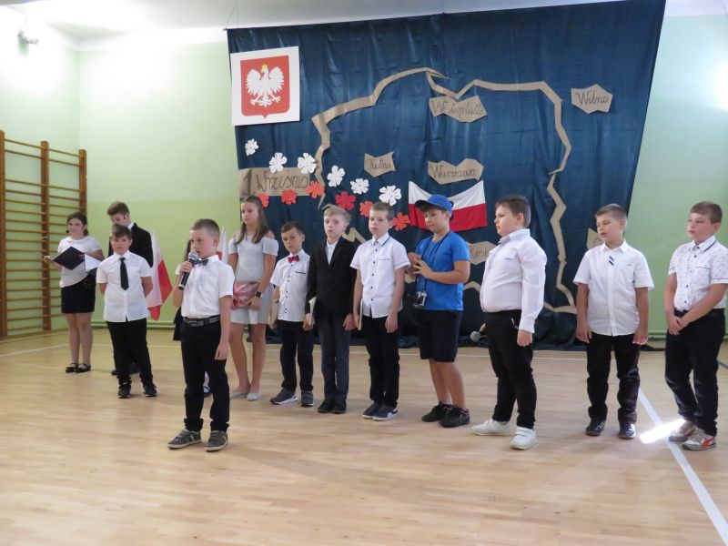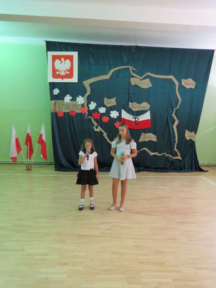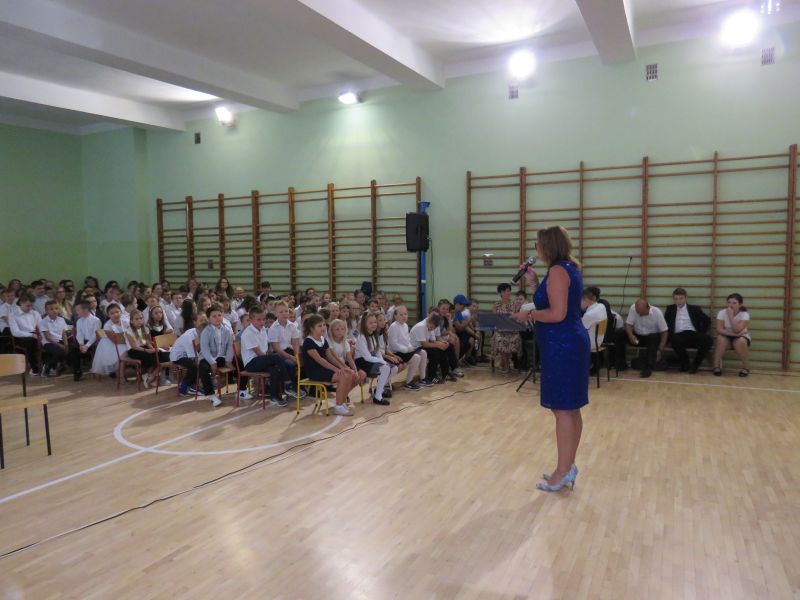 Nas normalnie dzwony kościelne wezwały na mszę świętą. W atmosferze radości i oczekiwania spotkaliśmy się w sali gimnastycznej. Wprowadzenie sztandaru szkoły i odśpiewaniu hymnu rozpoczęło inaugurację roku szkolnego. Uroczystość poprowadzili: Ola Wołkowicz i Kacper Ciapaj. Maciej Pyznar i Patryk Brach czuwali nad aparaturą i ścieżką dźwiękową. Emitowana animacja komputerowa "Niezwyciężeni" przybliżyła rocznicowe wydarzenia. Uczniowie klasy czwartej przedstawili krótką scenkę. Odważny Filip reprezentował pierwszoklasistów. Pani Dyrektor Iwona Jamro przedstawiła sprawy organizacyjne już ośmioletniej szkoły podstawowej. Serdecznie przywitała nowego księdza katechetę, Wojciecha Dudzika, a nagrody jubileuszowe wręczyła Państwu: Barbarze Kudławiec, Ryszardowi Jamro oraz Karinie Szura. Natomiast p. Anna Chochołek odebrała gratulacje za uzyskanie najwyższego stopnia awansu - nauczyciela dyplomowanego.