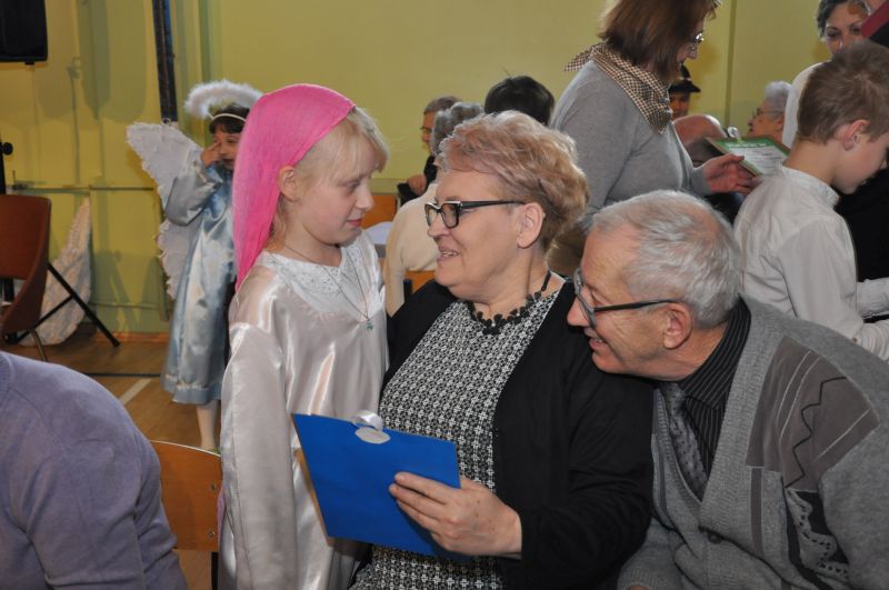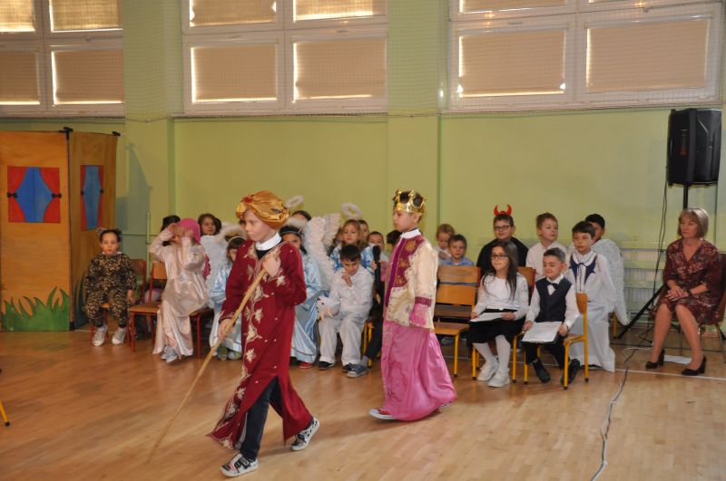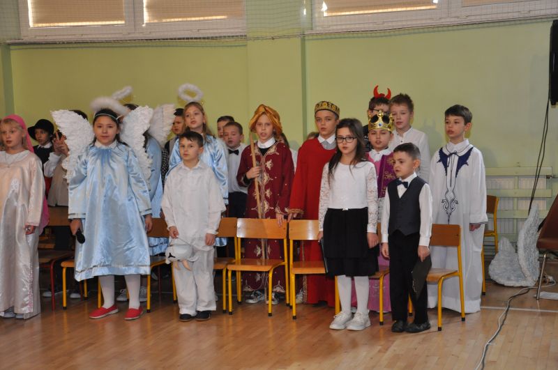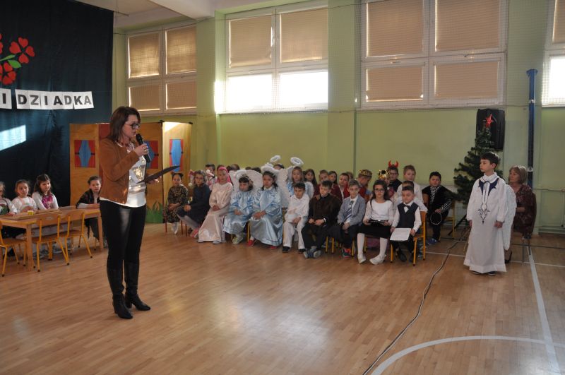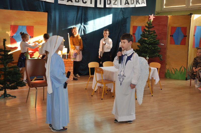 Na wstępie pani dyrektor dr Iwona Jamro przywitała wszystkich gości ciepłymi słowami i złożyła serdeczne życzenia. W pięknie udekorowanej sali gimnastycznej dzieci kl. II i III przedstawiły jasełka wigilijne "On przychodzi do nas takich, jakimi jesteśmy", natomiast pierwszoklasiści deklamowali wzruszające wiersze i śpiewali piosenki związane tematycznie z tym świętem.