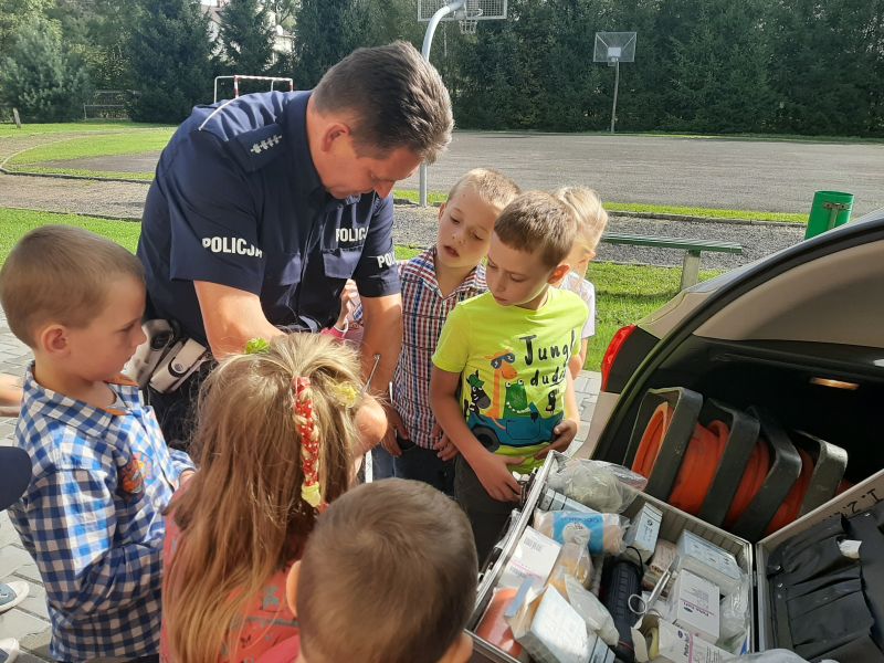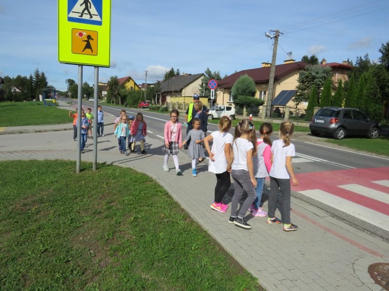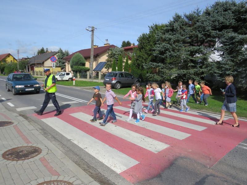 W naszej szkole duży nacisk kładziemy na bezpieczeństwo oraz edukację związaną z bezpieczeństwem dzieci. W dniu 11 września uczniowie klasy I uczestniczyli w spotkaniu z aspirantem sztabowym Pawłem Zawiślakiem – policjantem z Wydziału Ruchu Drogowego Komendy Powiatowej Policji w Gorlicach. Najmłodsze dzieci miały okazję porozmawiać o zachowaniu bezpieczeństwa w drodze do i ze szkoły, o bezpiecznym przechodzeniu przez ulicę, prawidłowym zachowaniu się na przejściach dla pieszych. Nasz Gość zwrócił uwagę na niebezpieczeństwa, jakie mogą czyhać na dziecko na drodze, omówił sposoby unikania lub pokonywania ich. Ponadto podkreślił, jak ważną rolę pełnią elementy odblaskowe. Dzieci odpowiadały na zadawane pytania, wykazały się wiedzą z zakresu bezpieczeństwa w ruchu drogowym, podawały liczne przykłady niewłaściwego zachowania się.