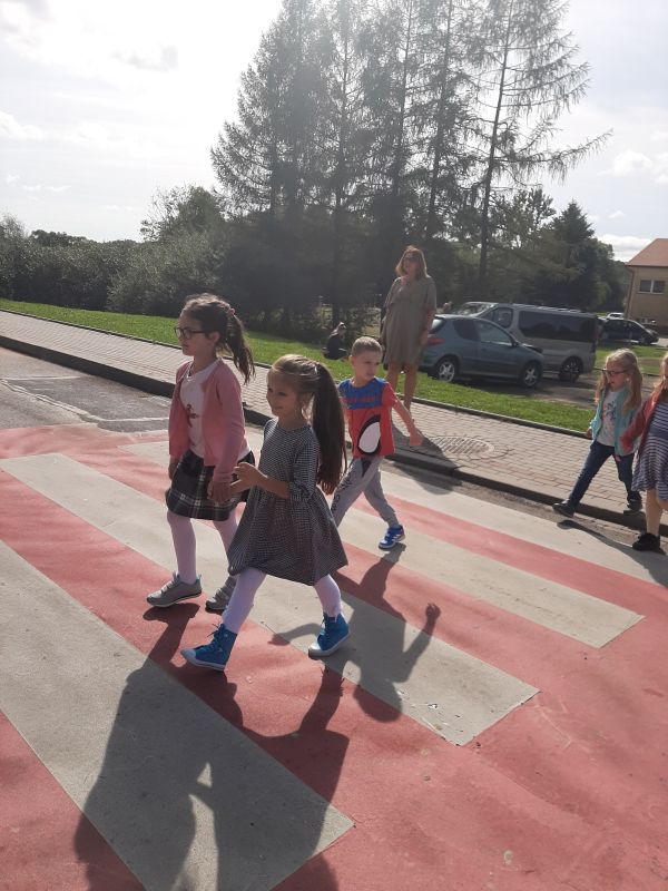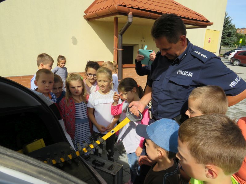Poruszane tematy cieszyły się dużym zainteresowaniem wśród uczniów, o czym świadczyły liczne pytania kierowane do Policjanta. Następnie dzieci miały okazję zobaczyć przyniesione przez naszego gościa podstawowe akcesoria policjanta; lizak, kajdanki czy pałkę policyjną. Najprzyjemniejszą częścią spotkania było obejrzenie radiowozu policyjnego z jego wyposażeniem. Na zakończenie dzieci pod okiem policjanta ćwiczyły prawidłowe przechodzenie przez jezdnię.