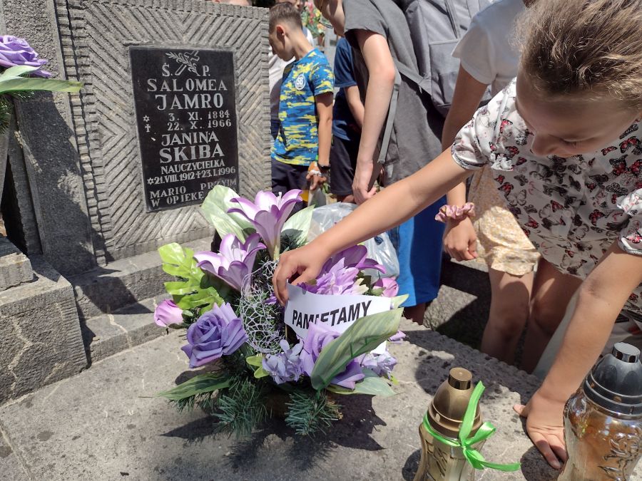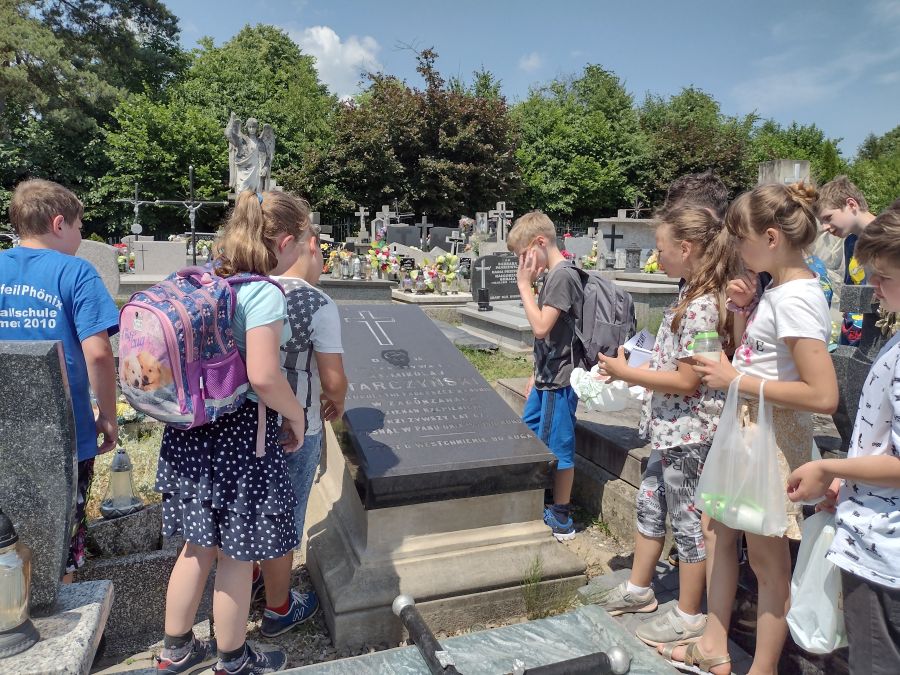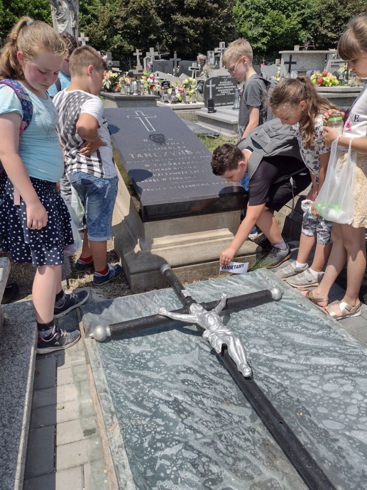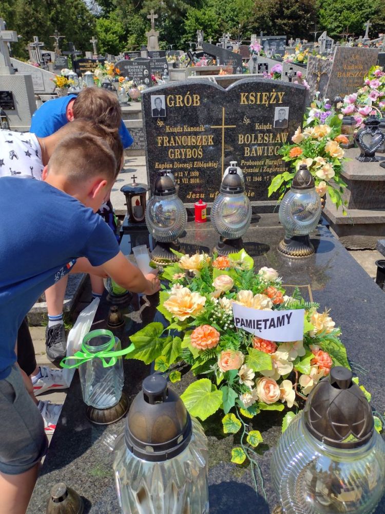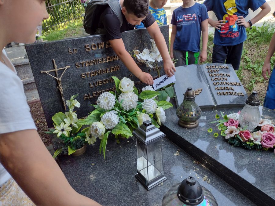 Uczniowie klasy piątej jeszcze jesienią zaplanowali inicjatywę "Pamiętamy o zmarłych nauczycielach". Niestety pandemia, zamknięcie szkół i cmentarzy przerwało zaawansowane przygotowania. Wróciliśmy do przerwanych prac. Z ozdobionymi zniczami i przygotowanymi chorągiewkami ruszyliśmy na cmentarz parafialny. Pamięć zmarłych nauczycieli uczciliśmy również chwilą modlitwy. Widoczne znaki z pewnością zwrócą uwagę innych, a młodszym pokoleniom wskażą, tych którzy dawno temu dbali o edukację ich rodziców i dziadków. Dla piątoklasistów była to wyjątkowa okazja sięgnięcia do szkolnego archiwum, kronik, galerii zdjęć, fotograficznych albumów oraz rozmów w rodzinach. Każda sylwetka nauczycieli, ale także księży katechetów i proboszczów stała się rozpoznawalna. W ten sposób budujemy dumę narodową, staramy się rozumieć wartość wolności, postaw odwagi i poświęceni, sensu pracy dla innych. Oni wszyscy kształtowali poprzednie pokolenia, trudzili się dla innych. To nasze wspólne dziedzictwo, zwłaszcza istotne dla lokalnej społeczności.