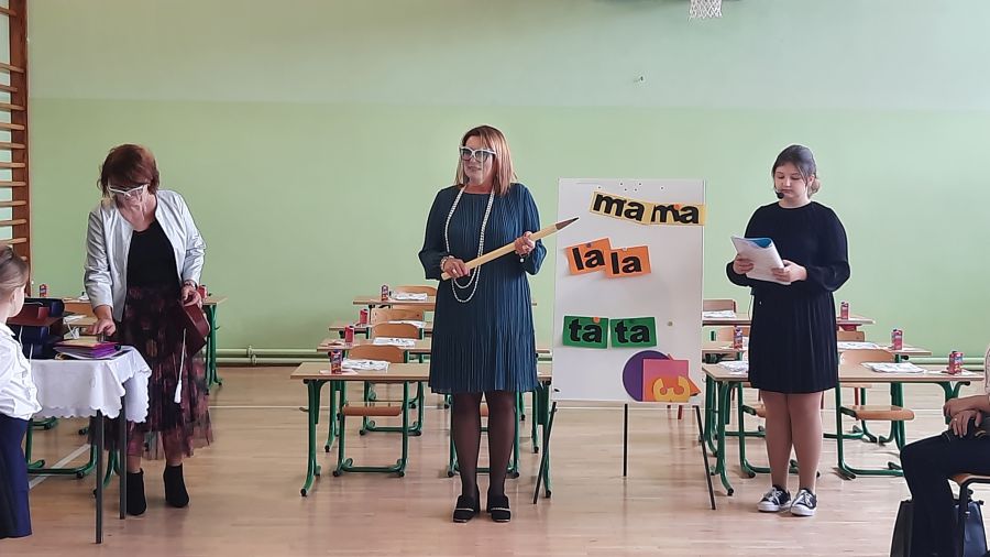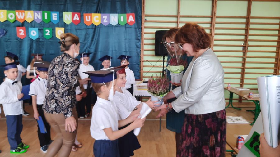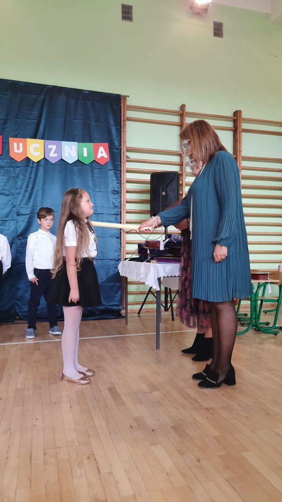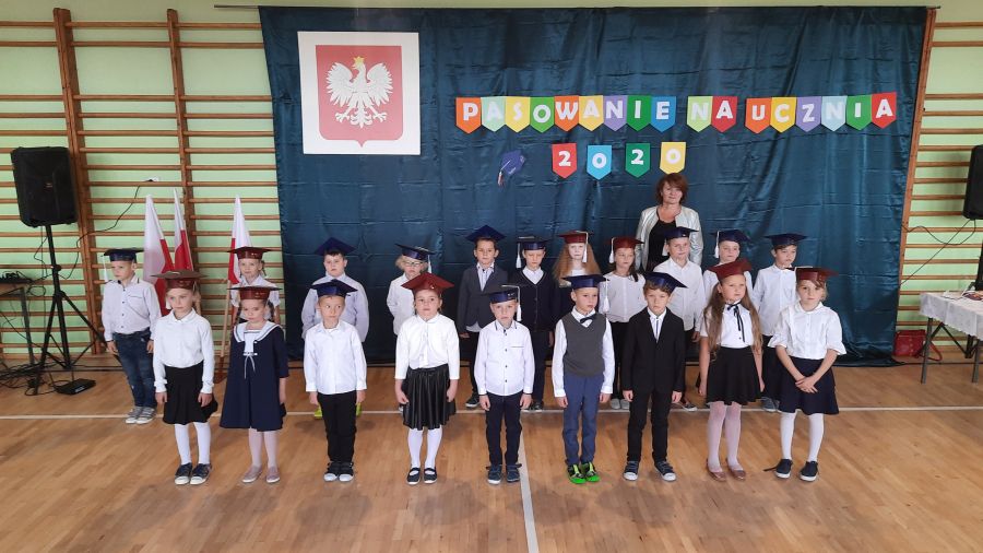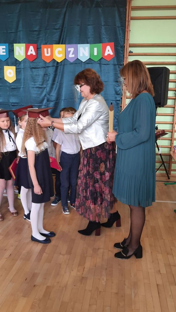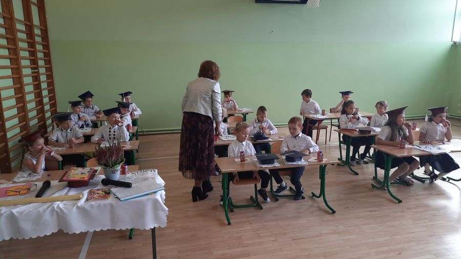 Następnie dyrektor szkoły pani Iwona Jamro za pomocą symbolicznego ołówka dokonała pasowania na Uczniów Szkoły Podstawowej im. Komisji Edukacji Narodowej oraz wręczyła dzieciom legitymacje szkolne. Natomiast wychowawczyni Marzena Nikiel wręczyła pamiątkowe dyplomy i nałożyła na głowy birety. Od tej chwili pierwszaki oficjalnie zostały przyjęte do braci uczniowskiej.