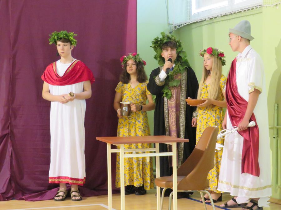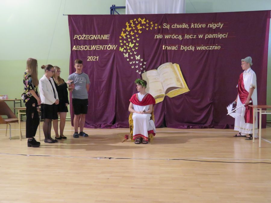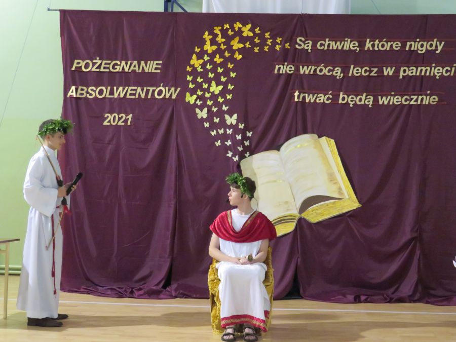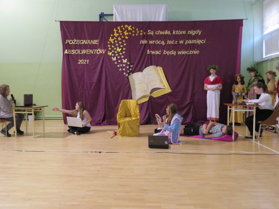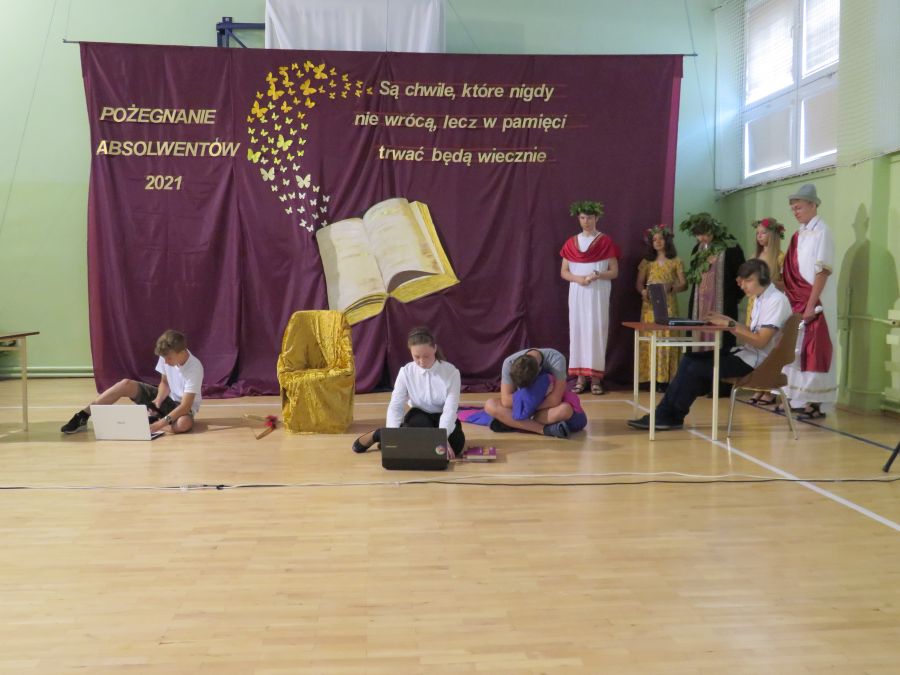 "Są chwile, które nigdy nie wrócą, lecz w pamięci trwać będą wiecznie", to słowa, które stanowiły myśl przewodnią programu artystycznego, jaki zaprezentowali uczniowie kończący szkołę podstawową. Absolwenci wrócili wspomnieniami do zdarzeń z minionych lat. Chcąc ukazać uczniowski los, udali się w olimpijskie progi, by złożyć skargę na trudny uczniowski byt. Niestety, zostali szybko zdemaskowani przez Gromowładnego, Atenę, Amora i Dionizosa, którzy ukazali Zeusowi ich prawdziwe oblicze, poczynania w czasie nauki stacjonarnej i zdalnej. Kiedy skruszeni uczniowie zapragnęli powrócić do szkoły, Zeus ogłosił wyrok. Zapragnął zamienić się miejscem z ósmoklasistami. W czasie występu młodzież zaprezentowała ciekawe typy uczniów, które wykreowały się w czasie pracy zdalnej. W humorystyczny sposób ukazała przebieg lekcji, które na zawsze pozostaną w ich sercach i pamięci.