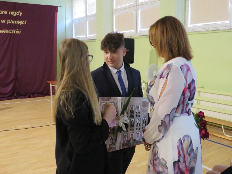 Na koniec absolwenci podziękowali Pani Dyrektor, nauczycielom i rodzicom za trud pracy włożony w ich wychowanie i nauczanie. Słowa wdzięczności skierowali również do pracowników obsługi, którzy na co dzień troszczyli się o to, by w szkole było czysto i bezpiecznie, by nie zabrakło ciepłych posiłków. Na czas letniego urlopu podarowali wszystkim pracownikom szkoły samodzielnie przygotowane "Niezbędniki", których zawartość ma zapewnić strudzonym pedagogom i pracownikom chwile wyciszenia, pomóc zregenerować nadwyrężone siły, osłodzić każdą chwilę życia. Scenografię przygotowali uczniowie klasy ósmej pod opieką wychowawczyni, pani Joanny Nosal.