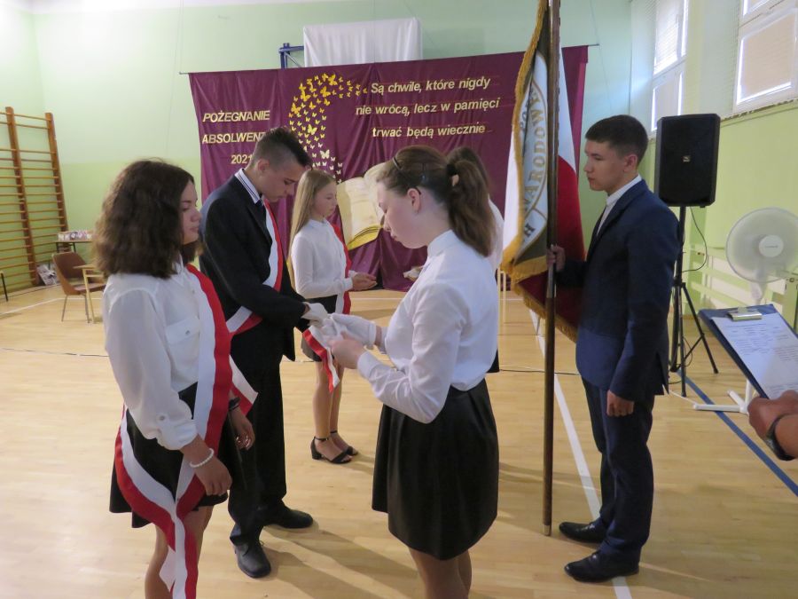 Zgodnie z ceremoniałem sztandar szkoły przejęli uczniowie nowej klasy ósmej: chorąży Miłosz Pruchnicki, Wiktoria Kuk i Milena Maniak.