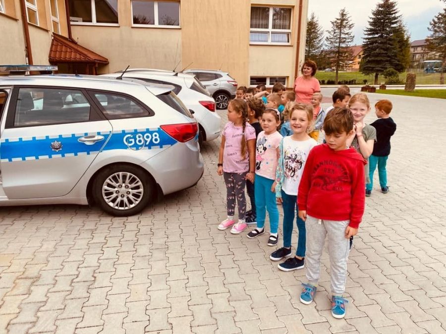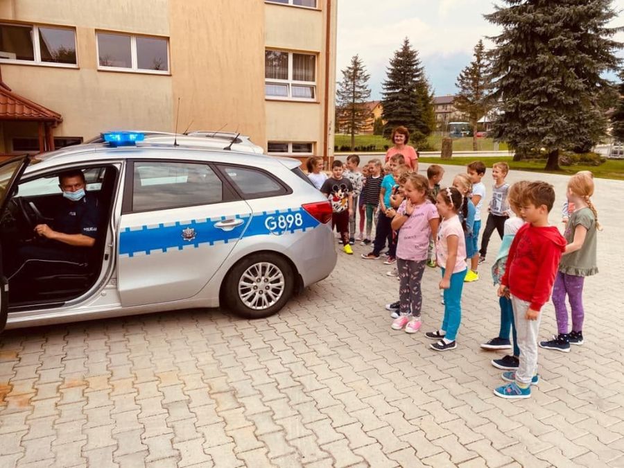17 września uczniowie klasy I gościli u siebie policjanta. Głównym celem spotkania było zapoznanie dzieci z niebezpieczeństwami grożącymi im w trakcie drogi do i ze szkoły, uświadomienie jak prawidłowo należy korzystać z drogi oraz jak zachować się, gdy spotkają na swojej drodze obcą osobę. Rozmawialiśmy na temat konieczności przestrzegania przepisów ruchu drogowego, zasad bezpiecznego przechodzenia przez drogę, utrwaliliśmy znajomość niektórych znaków drogowych. Dzieci miały okazję dowiedzieć się również, na czym polega praca policjanta. Obejrzały mundur wraz z odznaką i czapką oraz sprzęt jest potrzebny podczas służby. Wszystkich zainteresowały policyjne kajdanki. Największą jednak atrakcją był radiowóz i jego wnętrze. Jednak ze względu na panującą pandemię nie mogły wsiąść do samochodu, czy zabawić się w policjanta i złodzieja. Najwięcej radości wzbudziło włączanie sygnałów alarmowych. To był dzień, który na długo pozostanie w pamięci dzieci.