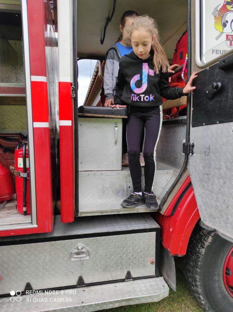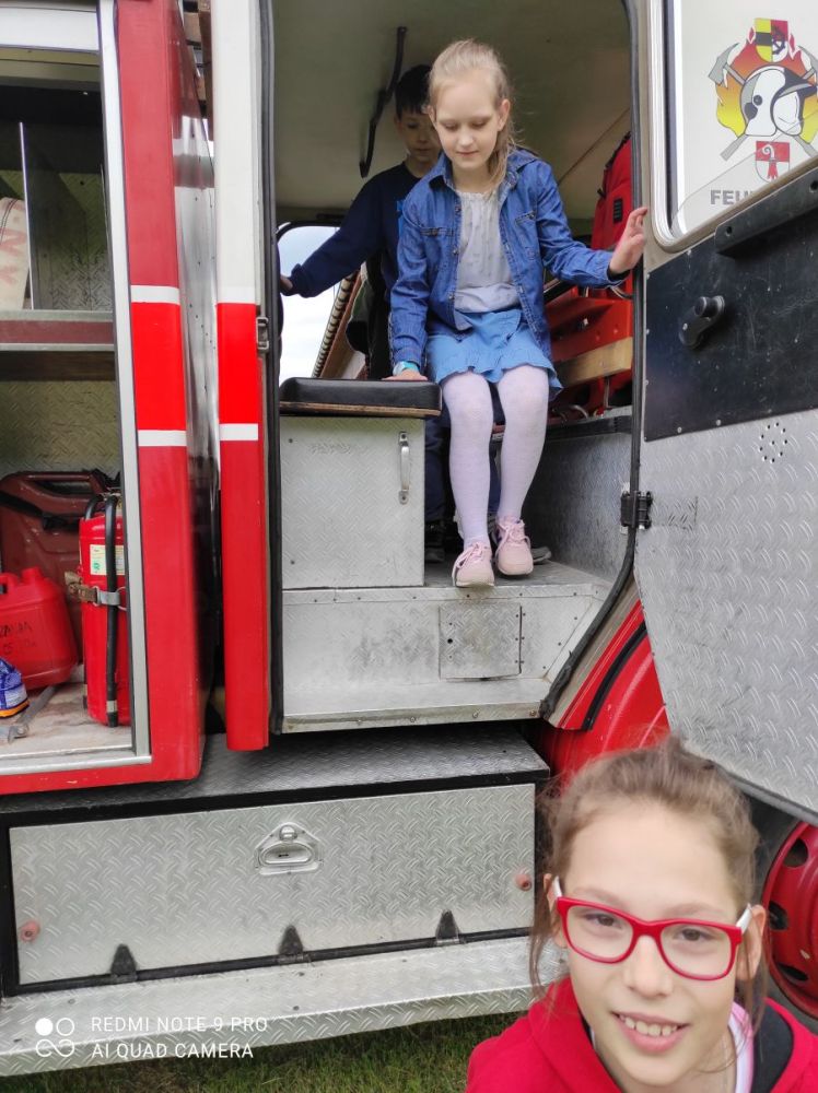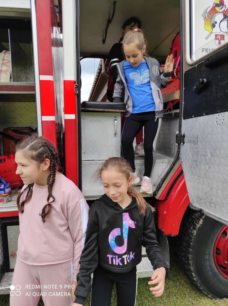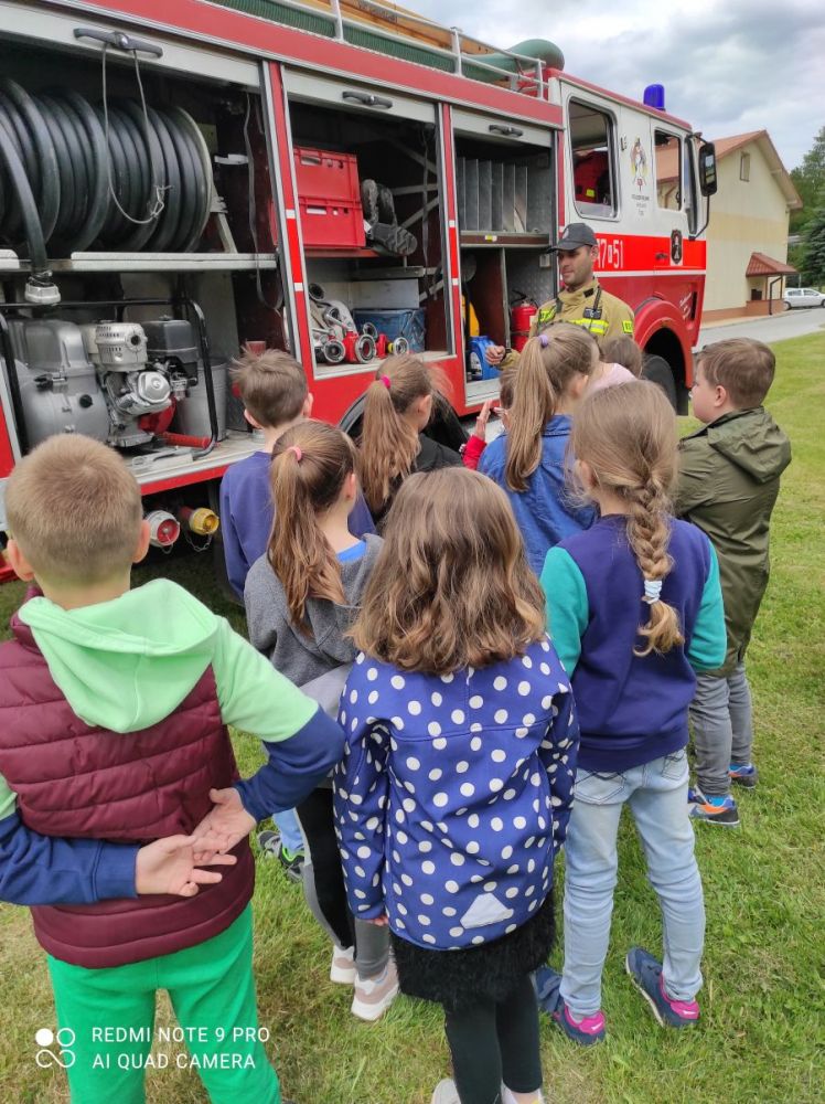 A potem zaczęło się … Na szkolny plac zawitał wóz bojowy należący do Ochotniczej Straży Pożarnej w Zagórzanach. Absolwent naszej szkoły, Mateusz Firszt oraz pan Radosław Pruchnicki objaśnili wszystkim zebranym wyposażenie samochodu bojowego. Uczniowie – strażacy wyjechali na "akcję". Rozlegał się prawdziwy sygnał alarmowy, czym wzbudzili niemałą sensację w okolicy. Następnie gasili okoliczny pożar, mierząc swoje siły w utrzymaniu węża pożarniczego z wodą. Cała akcja, której obserwatorami byli uczniowie klasy trzeciej, przysporzyła sporo śmiechu i zabawy. Była też lekcją uświadamiającą trudną, niejednokrotnie narażającą życie ludzkie, pracą strażaków.