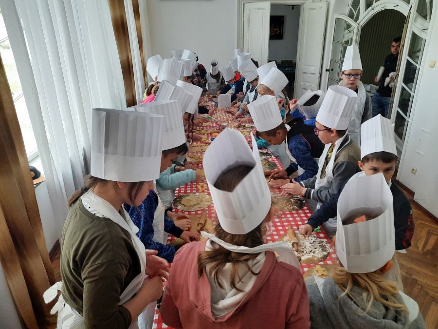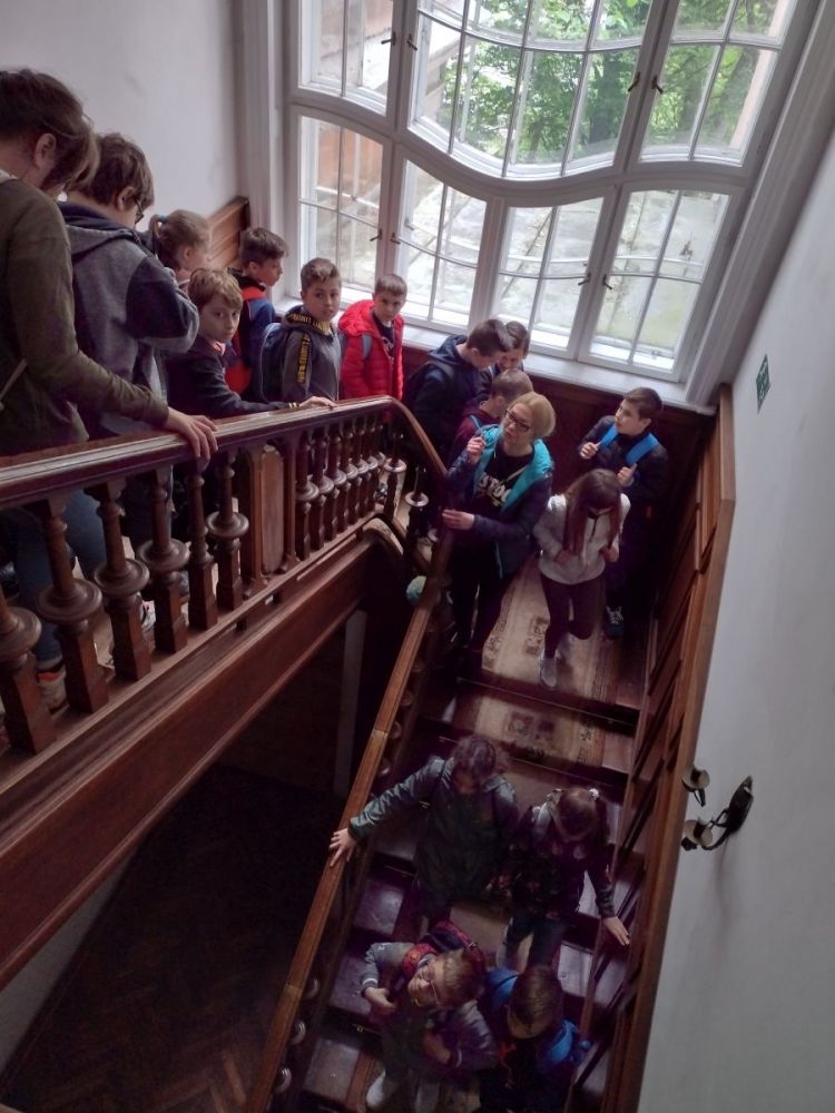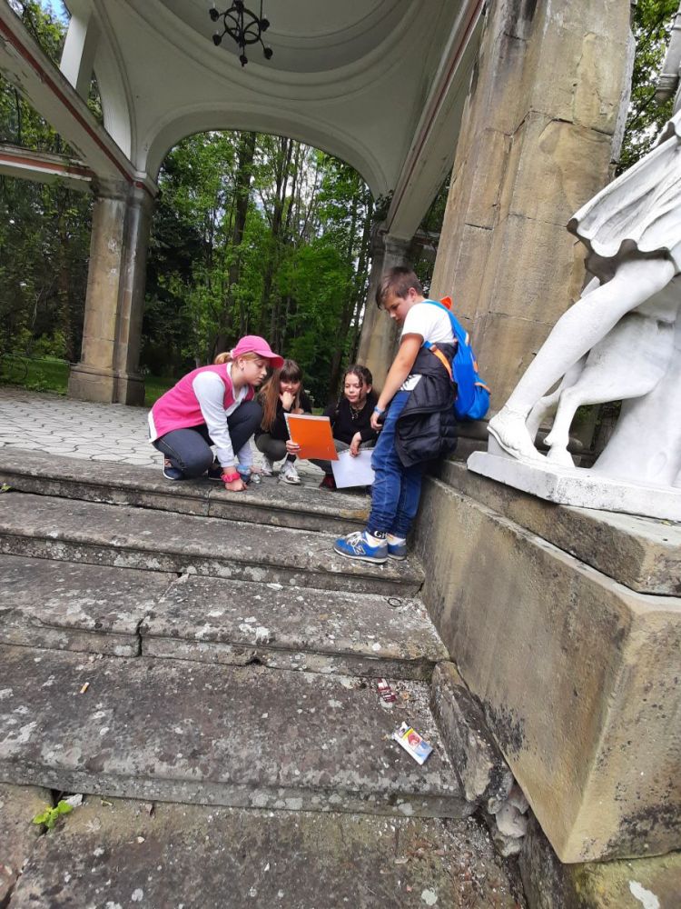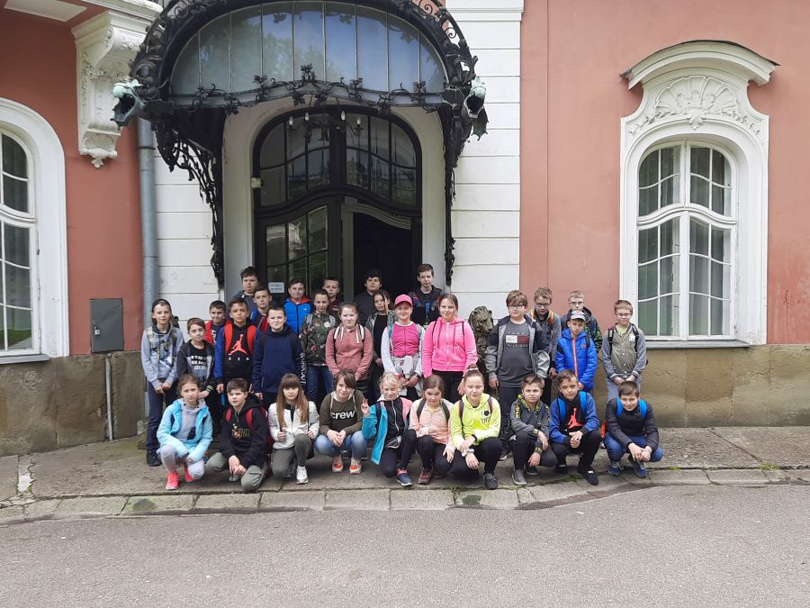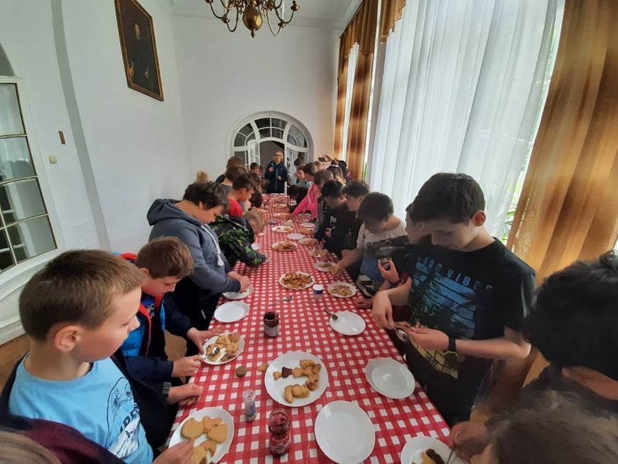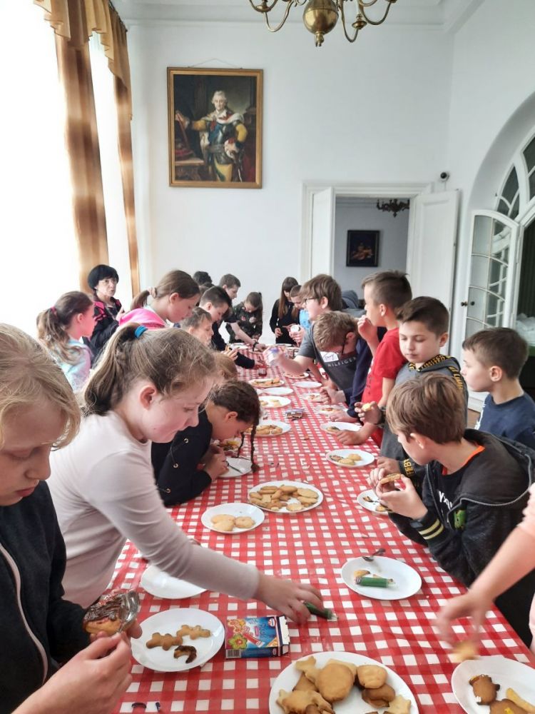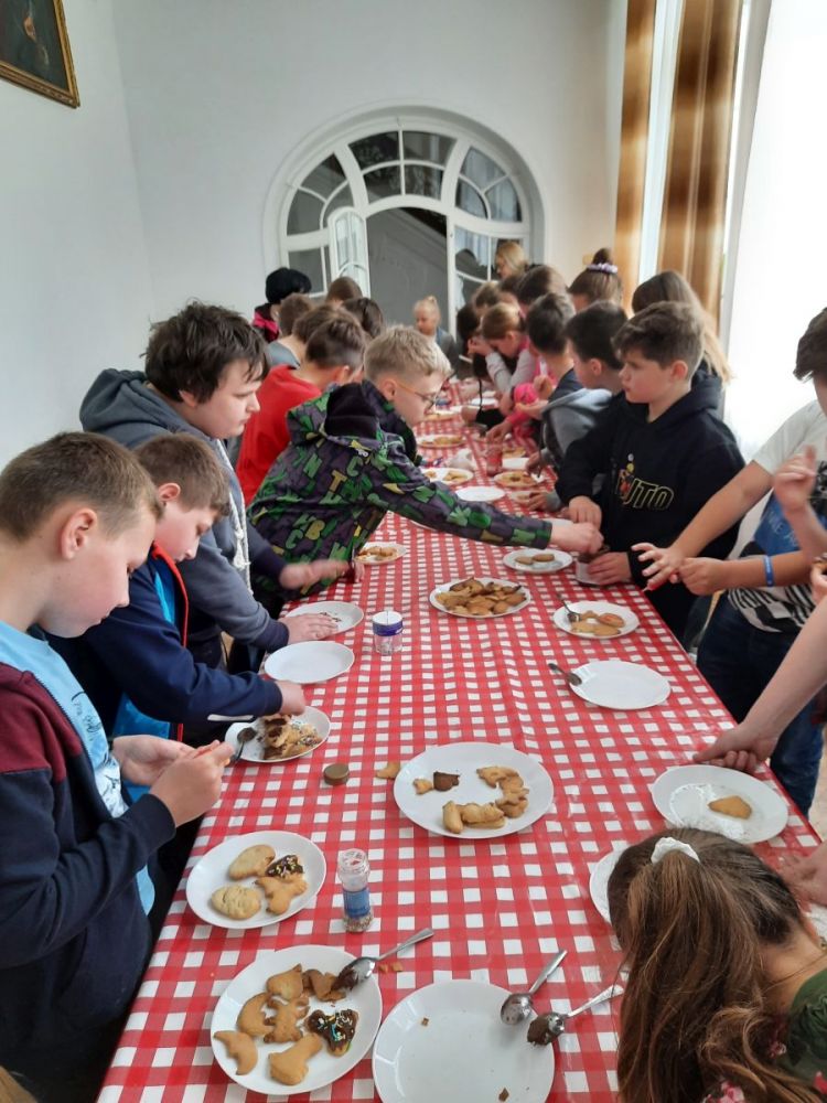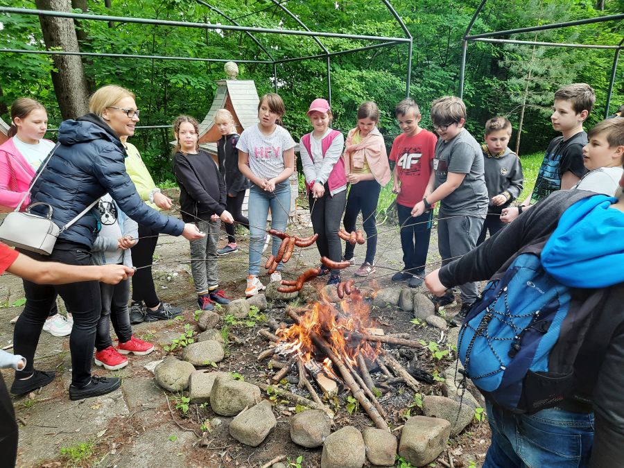 I wreszcie nadszedł ten dzień – Dzień Dziecka! Wychowawczynie klasy czwartej oraz piątej zabrały swoich podopiecznych do Pałacu w Siarach. Luksusowa rezydencja pioniera i potentata naftowego naszego regionu stała się miejscem warsztatów ciastkarskich. Każde dziecko wyposażone w fartuch i czapkę kucharską na swoim własnym stanowisku wałkowało, podsypywało i znów wałkowało bazę, aby wycinać różnorodne ciasteczka. Wypieki wróciły do autorów, którzy dekorowali z wykorzystaniem swojego kunsztu artystycznego. Były gwiazdeczki, kwiatuszki, zwierzątka, domki oraz kreatywne kształty własne. Własnoręcznie wykonane ciasteczka zachwycały kolorami, dodatkami, a przede wszystkim wyjątkowym smakiem. Następnie dzieci zwiedziły reprezentacyjne i prywatne pokoje naftowej arystokracji, podziwiały meble, wyposażenie, porcelanę, kryształowe lustra. Przekonali się jak dziś funkcjonuje obiekt. A potem… nadeszło to najbardziej zaskakujące – GRA TERENOWA. Osiem mieszanych drużyn odebrało mapę pałacowego parku i kartę zadań. Ważna była poprawność odpowiedzi, ale również liczył się czas wykonania. Zadania zaskoczyły wszystkich: szyfr, krzyżówka, hasło, trochę matematyki, trochę historii, trochę wiedzy ogólnej. Uff… nie było łatwo. Nad prawidłowym przebiegiem czuwały wychowawczynie oraz dzielna asystentka Ola. Grę ukończyli wszyscy i to z sukcesem. Pokonali trasę, rozwiązali zadania, pokonywali własne trudności, dotarli do mety. Najważniejszy cel został osiągnięty – była świetna zabawa. Kiedy dzieci kończyły zdanie: Dziś podobało mi się… , pojawiła się właściwie jedna odpowiedź: gra terenowa. Zwieńczeniem dnia było ognisko i pieczenie kiełbasek. Po ciężkim roku izolacji z ogromną przyjemnością dzieci cieszyły się własnym towarzystwem, dały upust emocjom, odnowiły pozytywne relacje, korzystały z ruchu na świeżym powietrzu. Panowała miła atmosfera i poczucie bezpieczeństwa.
