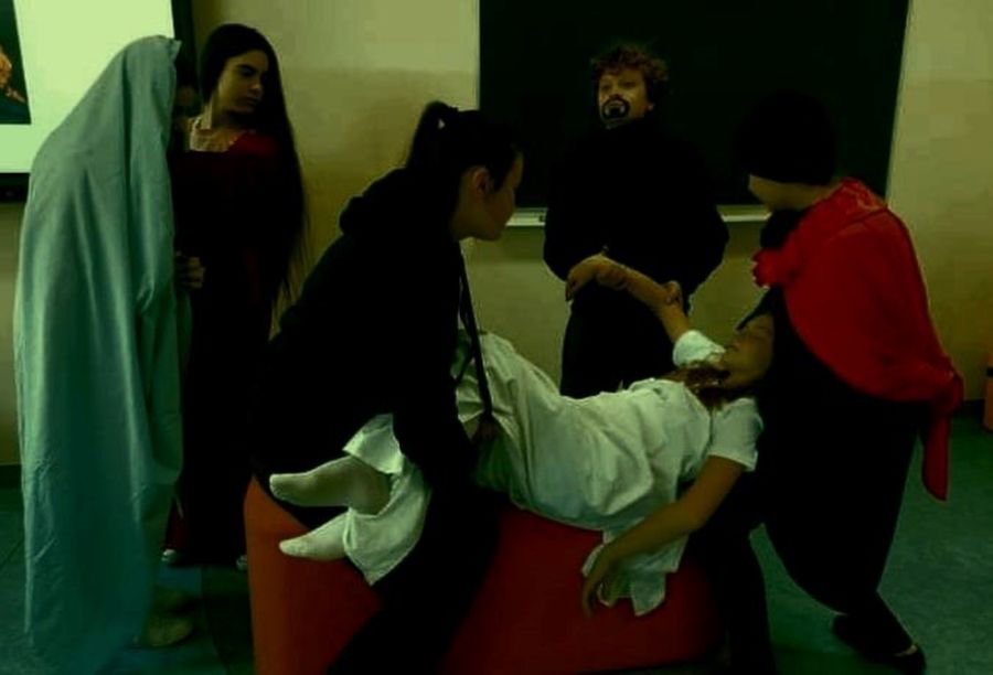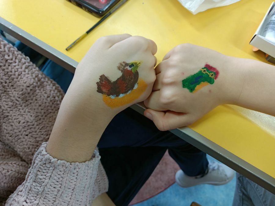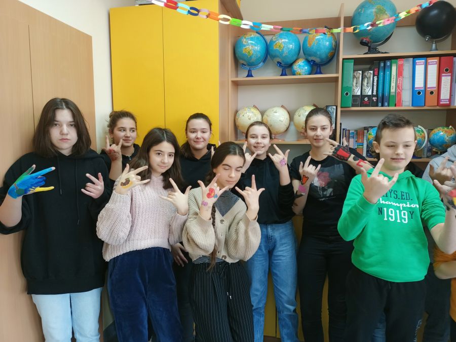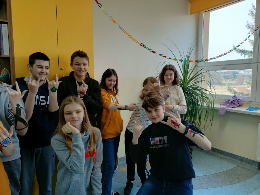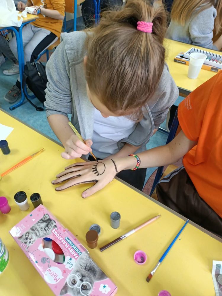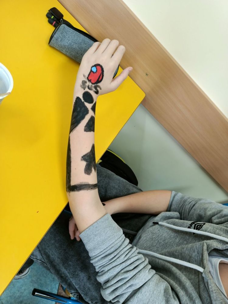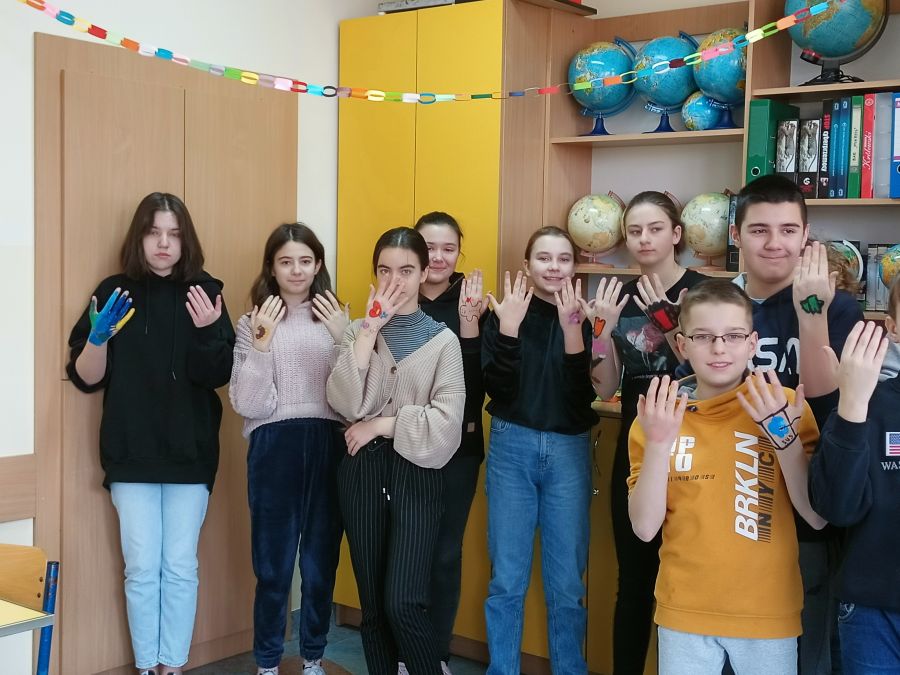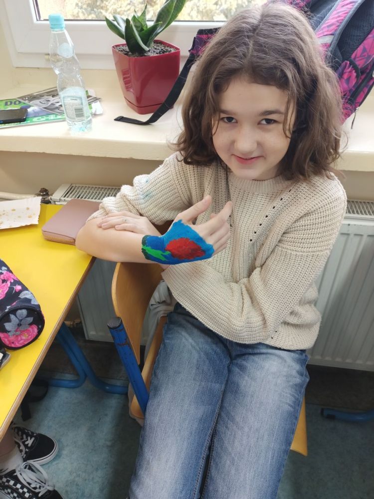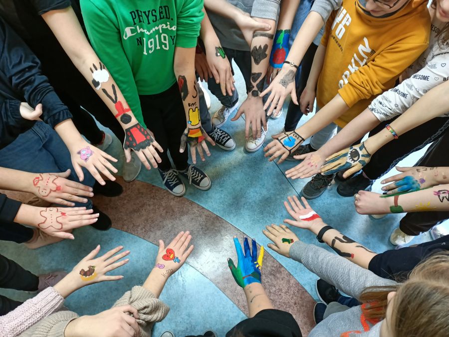 W obecnym nauczaniu proces działań plastycznych przebiega w pośpiechu, bez możliwości zachowania elementarnych wymogów procesu twórczego. Stąd wynika potrzeba prowadzenia zajęć w taki sposób, by uczniowie mieli możliwość rozwijania zainteresowań, zdolności manualnych i rozbudzania wyobraźni. Na nauczycielu bowiem, spoczywa odpowiedzialność za kreowanie wrażliwości, twórczej postawy i pomoc w odkrywaniu siebie. Dlatego zadaniem uczniów klasy VII na lekcji plastyki, było przedstawienie wybranego przez nauczyciela obrazu. Uczniowie zostali podzieleni na grupy, w grupie każda osoba odpowiedzialna była za wcielenie się w postać, która została dla niej wybrana. Stworzyli zatem "Żywy obraz" a efekty swoich prac prezentujemy na stronie szkoły. Kolejna twórcza praca to "Malowane dłonie". Było na pewno, kreatywnie, zabawnie i ciekawie. Zapraszamy do galerii.
