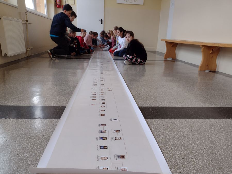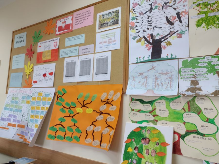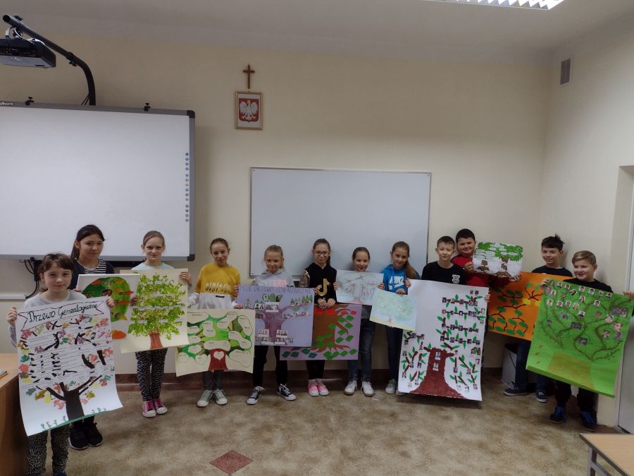 Kreatywność uczniów przejawia się w różnych sytuacjach. W klasie czwartej poznają warsztat historyka. Spodobała im się jedna z nauk pomocniczych - genealogia, nauka badająca więzi rodzinne na bazie pokrewieństwa i powinowactwa. Mali badacze otrzymali instrukcję, zbierali informacje, przeglądali zdjęcia w albumach, rozmawiali z rodzicami i dziadkami, odwiedzali cmentarze, robili notatki. Po czterech tygodniach w piątek 19 listopada zaprezentowali efekty projektu edukacyjnego "Drzewo genealogiczne mojej rodziny". Powstały wspaniałe samodzielne prace, estetyczne, kolorowe, zaplanowane tak, aby pokazać wszystkich członków rodziny. Autorzy z przejęciem opowiadali o swoich wysiłkach, podawali ciekawostki rodzinne, prezentowali kolejne pokolenia. Prace zostały wyeksponowane w sali lekcyjnej. Interesujące zwieńczenie zapewniła nam Ania Uszko, która przyniosła drzewo genealogiczne wykonane w rodzinie z okazji jubileuszu swoich dziadków. Czwartoklasiści z pasją zrealizowali pierwszy z projektów edukacyjnych. Zasłużyli na 6!