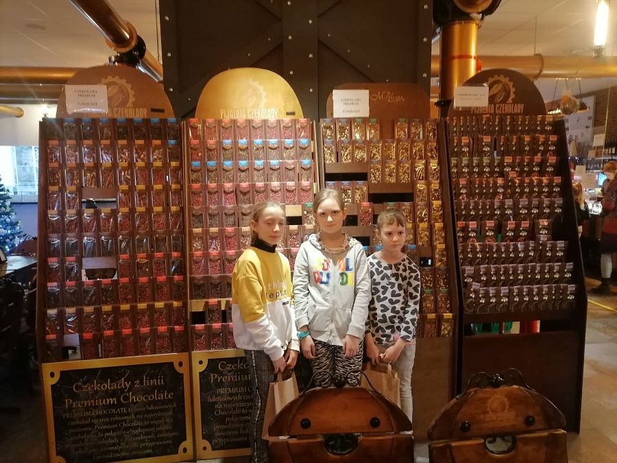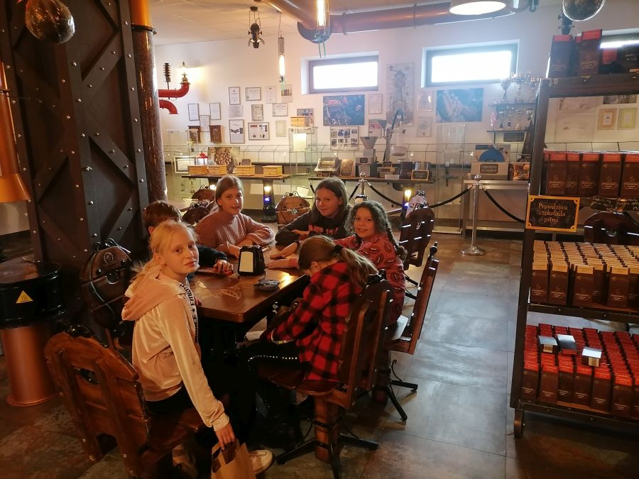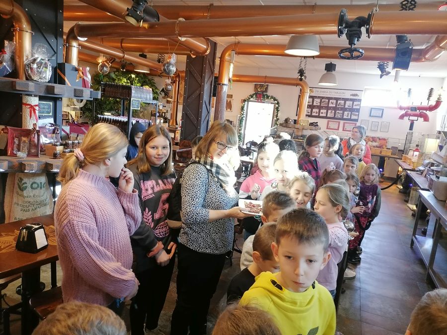 23 listopada 2021 r. uczniowie klasy I, IV i V uczestniczyli w wyjeździe edukacyjnym do Pijalni Czekolady w Korczynie koło Krosna. Nasi wychowankowie wzięli udział w niezwykłych warsztatach prowadzonych przez mistrza cukiernictwa, właściciela firmy – pana M. Pelczara. W tym magicznym miejscu, utrzymanym w stylu starej fabryki czekolady, uczniowie ujrzeli egzotyczne drzewo kakaowca, poznali schemat procesu produkcji czekolady, dowiedzieli się, skąd pochodzą różne odmiany ziarna używane do produkcji w korczyńskiej fabryce. Podczas prelekcji uczestnicy mogli wielokrotnie degustować różne rodzaje czekolady.
