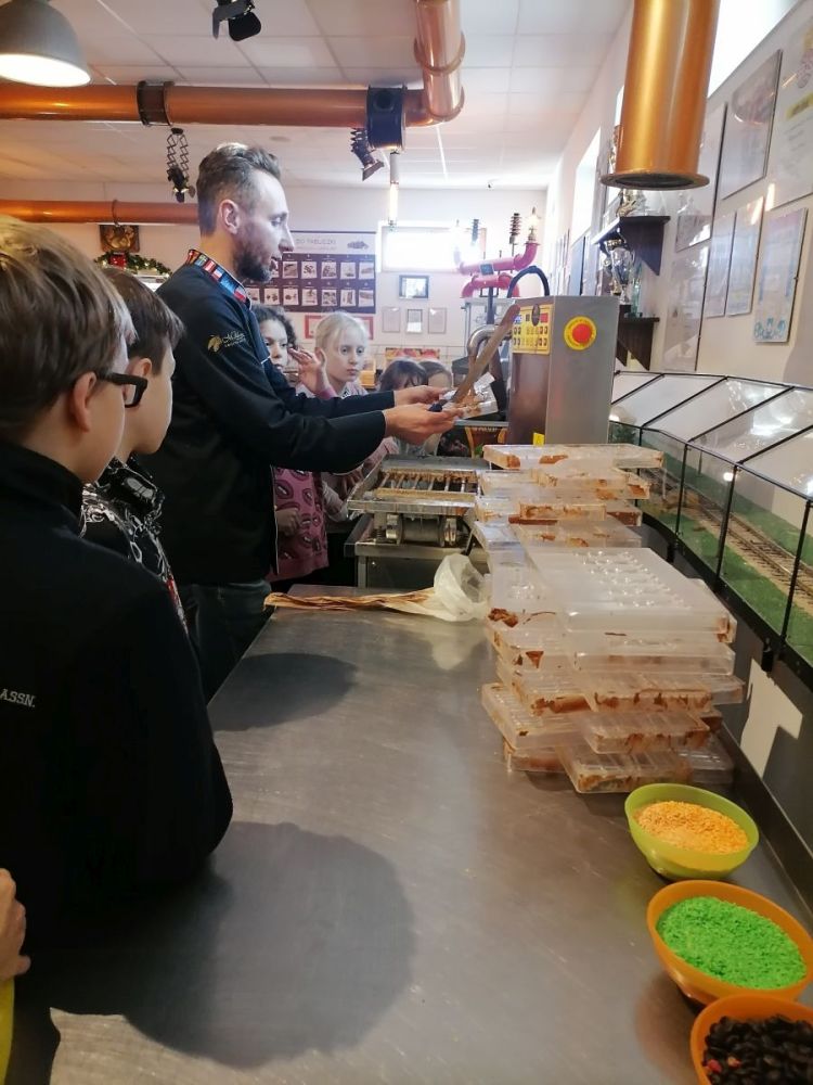 Właściciel zakładu zadbał o atrakcyjność warsztatów, organizując konkursy wiedzy, w których uważni uczniowie mogli zdobyć słodką nagrodę lub bon upominkowy. Pan M. Pelczar pokazał, jak wygląda prawdziwa linia produkcyjna. Dzieci mogły od podstaw zgłębiać tajniki produkcji, powstawania, zdobienia i pakowania wyrobów. Największych emocji doświadczyli podczas samodzielnego wyrobu czekolad i lizaków, zdobienia wykonanych ręcznie produktów. Wiedzę o ziarnie kakaowca wzbogacili też poprzez seans filmowy. Po spotkaniu uczniowie udali się na zakupy wyrobów z czekolady.