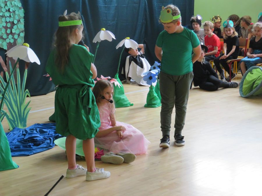 Dnia 15 czerwca uczniowie kl. I uczęszczający na kółko teatralne "Szkolna Kurtyna" zaprezentowali spektakl teatralny oparty na motywach baśni H. Ch. Andersena "Calineczka". Został on przygotowany pod kierunkiem p. Ewy Zasowskiej. Sztuka została wystawiona dla dzieci z Samorządowego Przedszkola w Zagórzanach. Pierwszoklasiści z wielkim zaangażowaniem odegrali swoje role. Wcielili się w role baśniowych bohaterów. Nie zabrakło wśród nich chrabąszczy, żab, motyla, myszki, kreta, jaskółki, kobiety, wróżki, elfa, no i oczywiście Calineczki. Kwestie mówione przeplatane były śpiewem co uatrakcyjniało cały występ. Całości przedstawienia dopełniła piękna dekoracja oraz oryginalne stroje i rekwizyty. Po zakończeniu występu Dyrektor Szkoły dr Iwona Jamro podziękowała małym artystom za wspaniały występ. Widzowie nagrodzili uczniów gromkimi brawami.