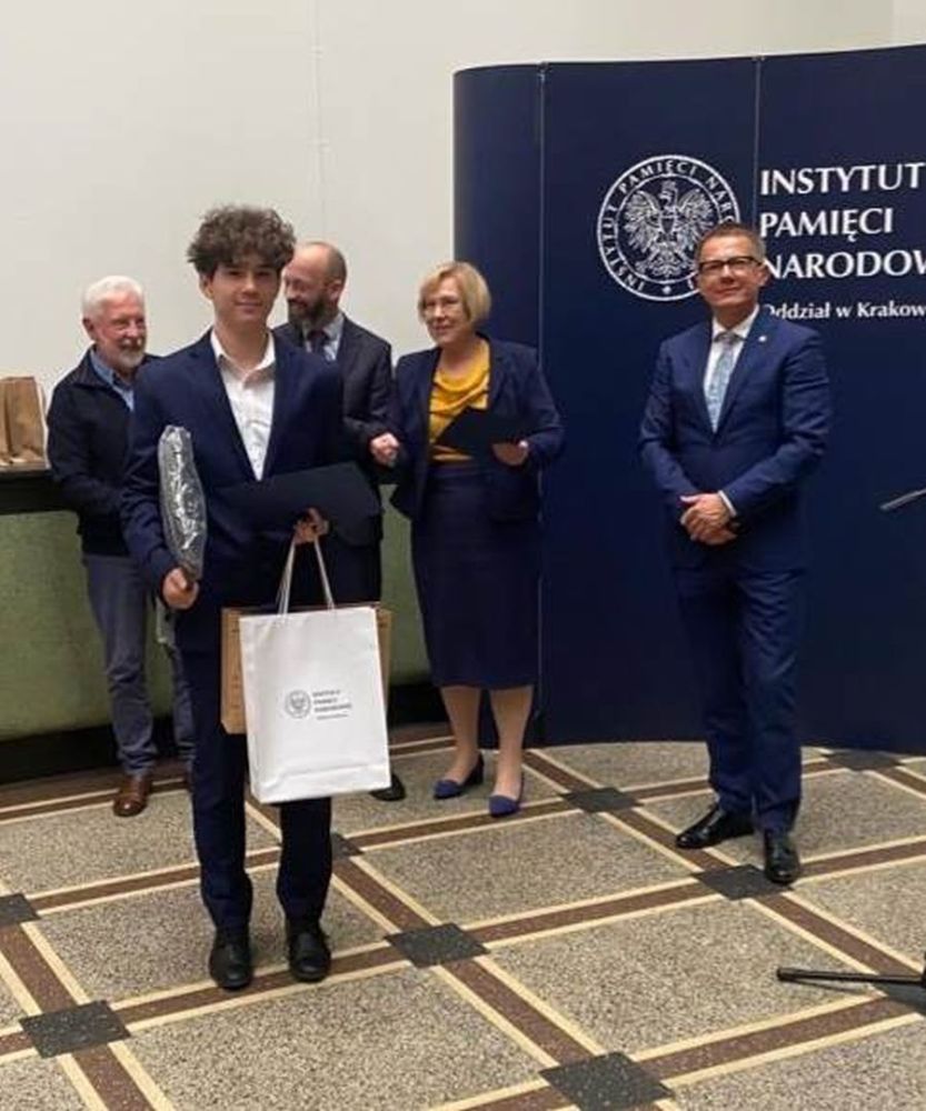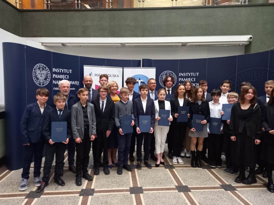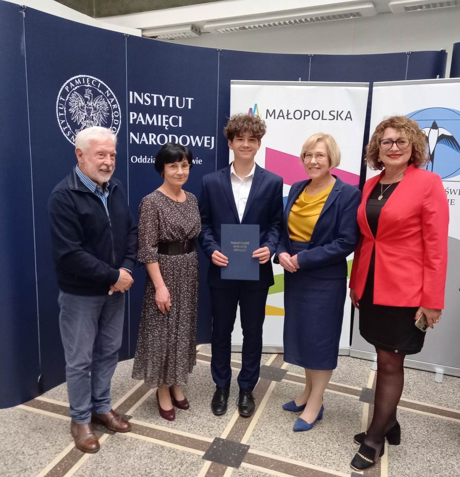 Antoni Ciapaj uczeń klasy ósmej 17 maja w Centrum Edukacyjnym IPN "Przystanek Historia" w Krakowie odebrał dyplom laureata oraz nagrody rzeczowe. Uzyskał 60 punktów na 60 możliwych, co uplasowało go na I miejscu w Konkursie Tematycznym Polscy żołnierze w walce o wyzwolenie Włoch, Francji, Belgii i Holandii podczas II wojny światowej dla uczniów szkół podstawowych województwa małopolskiego. Brawurowo przeszedł przez kolejne etapy: rozwiązywał test wiedzy, w oparciu o archiwalne źródła historyczne zredagował pracę pisemną "By wolnym był znów ich piastowski ród", którą obronił podczas ustnego przesłuchania dnia 30 marca. W zmaganiach konkursowych uczestniczyło 640 uczniów, a tytuł laureata wywalczyło tylko 21. Antoś udowodnił, jak wiele może uczeń osiągnąć wykorzystując predyspozycje, podejmując wyzwania. Godnie reprezentował naszą Szkołę. Ogromna satysfakcja z włożonego wysiłku, ogromne gratulacje uzdolnień, pełnego zaangażowania i rewelacyjnych efektów na najwyższym szczeblu.
