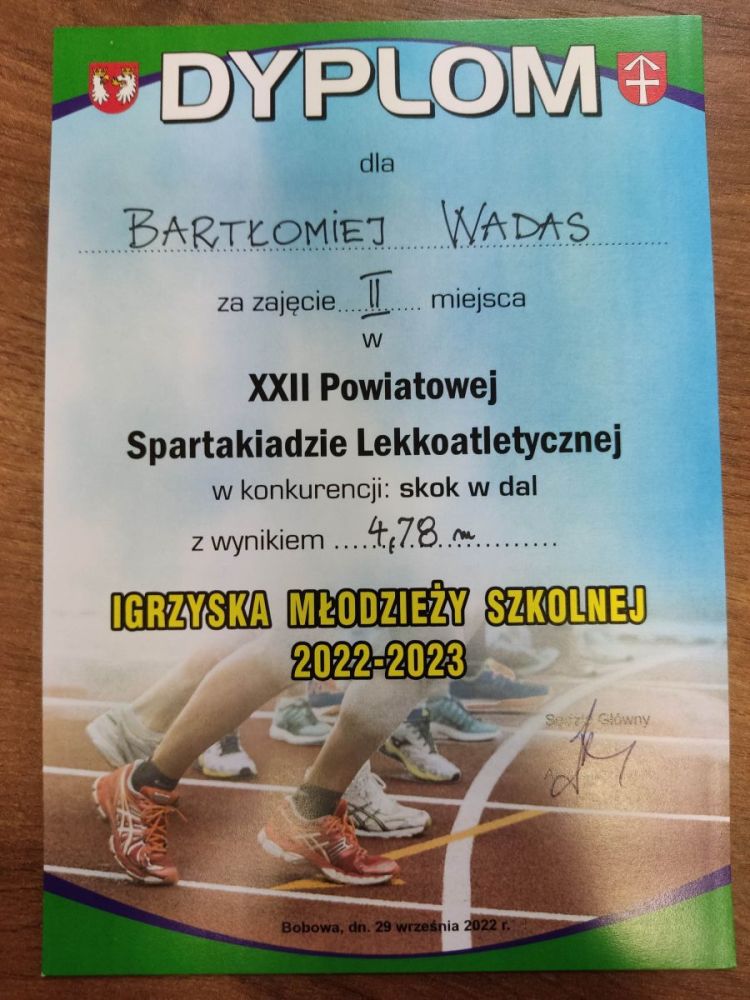 Bartłomiej Wadas z wynikiem 4.78 w skoku w dal, zajął 2 miejsce w zawodach powiatowych LA, które odbyły się w ramach Igrzysk Młodzieży Szkolnej zorganizowanych w Bobowej.