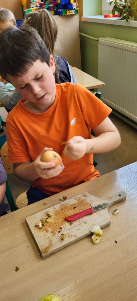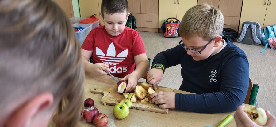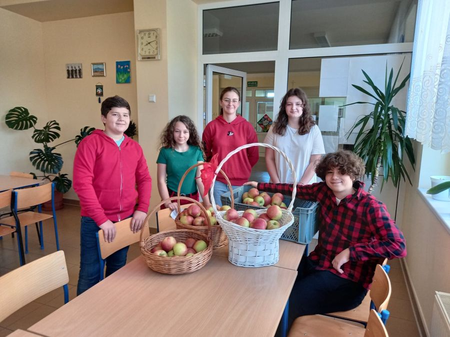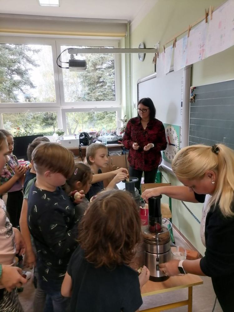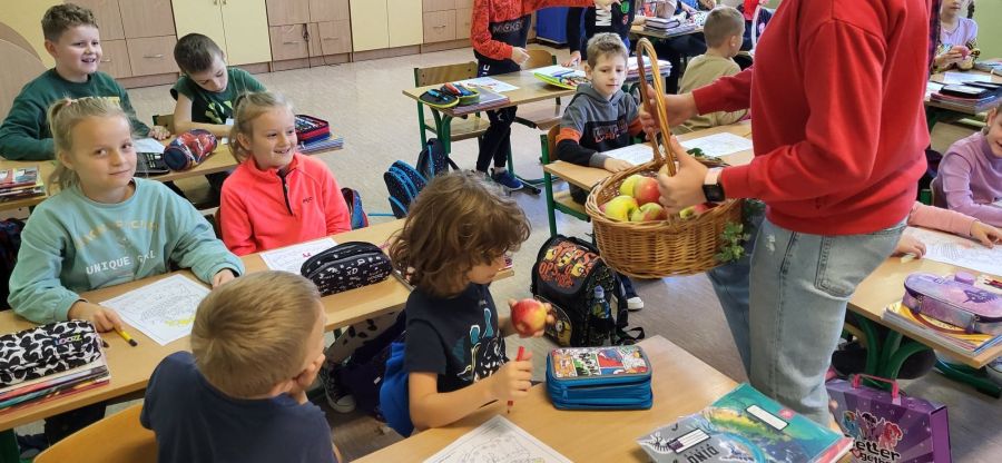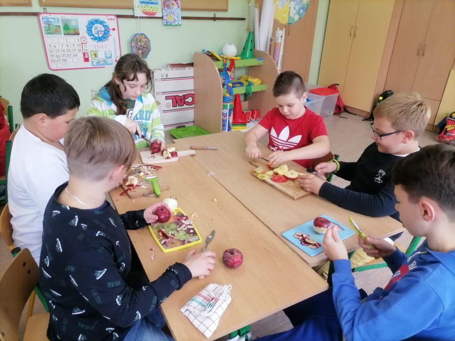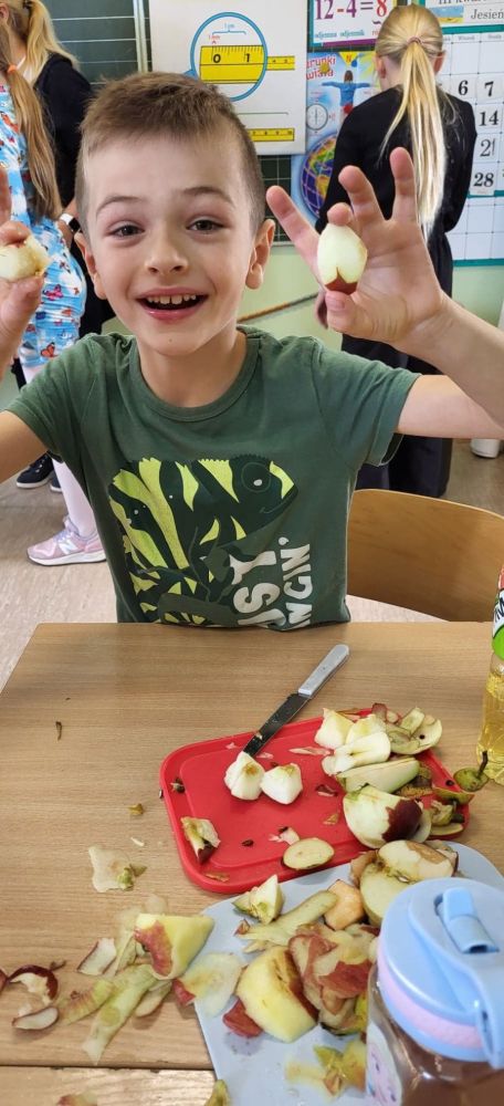 28 września świętowaliśmy Międzynarodowy Dzień Jabłka. W tym dniu dzieci przyszły do szkoły ubrane w kolorach jabłek. Była to też okazja, aby przypomnieć, że jedzenie warzyw i owoców jest podstawą, aby zapewnić sobie zdrowie. Samorząd Uczniowski częstował wszystkich jabłkami a temat owocu królował na każdej lekcji. I tak: jabłka dzieliliśmy i mnożyli, o jabłku pisaliśmy i śpiewali. Było jabłko rysowane, graficznie tworzone a nawet degustowane w postaci szarlotki czy soku.