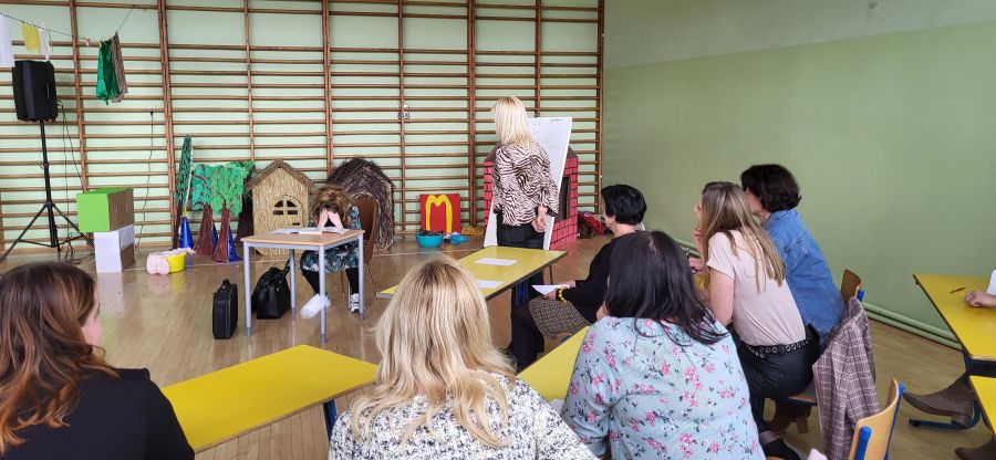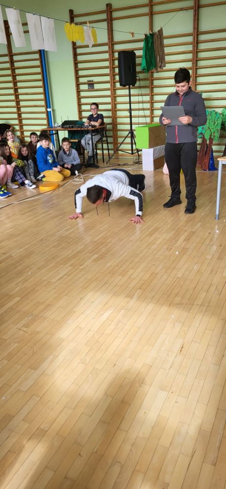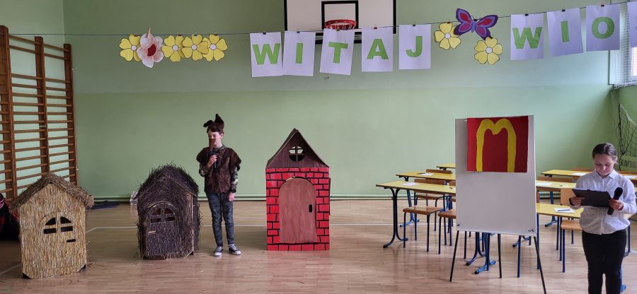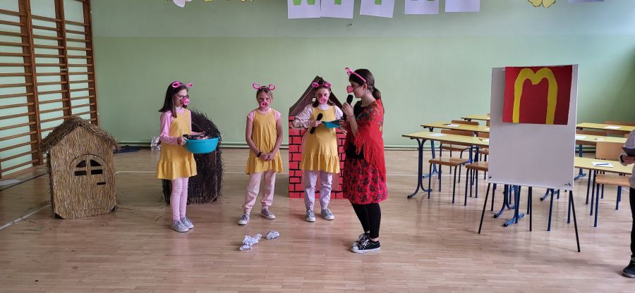 Następnie klasa V zaprosiła wszystkich na salę gimnastyczną na przedstawienie "Trzy świnki". Nie było to jednak zwykłe przedstawienie. Aby zrozumieć występujących aktorów, trzeba było mieć chociaż podstawowe umiejętności posługiwania się językiem angielskim. Uczniowie pracowali nad scenariuszem w języku angielskim i scenografią na dodatkowych zajęciach rozwijających zainteresowania, pod okiem pani Anny Chochołek.