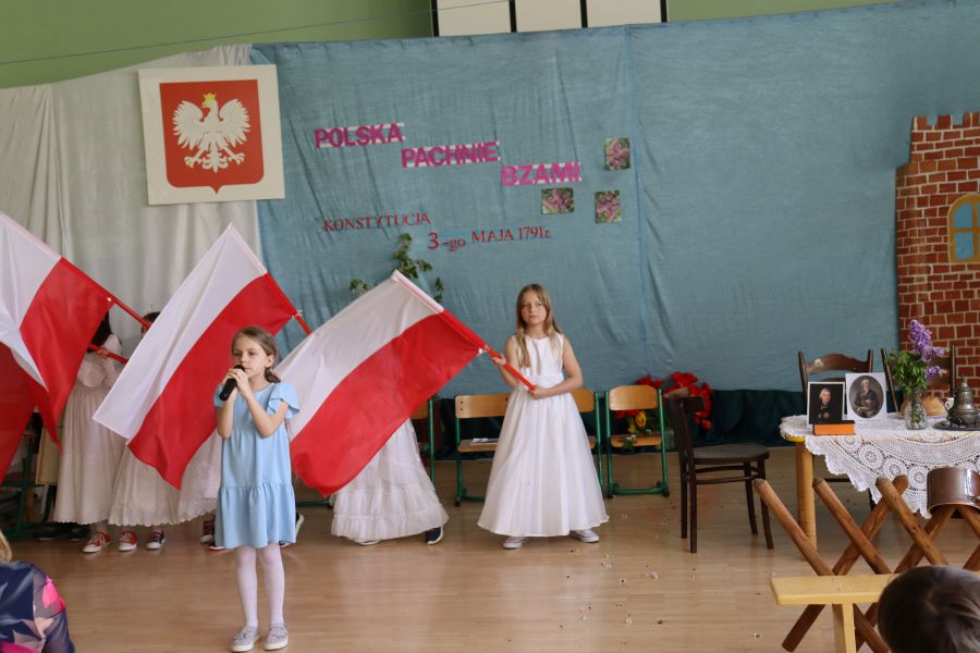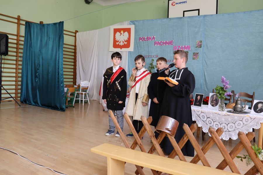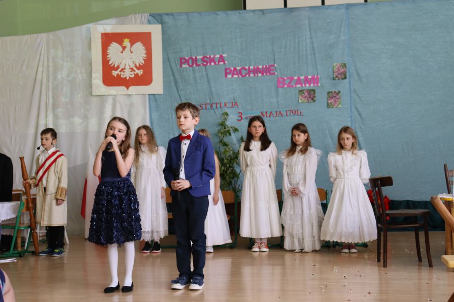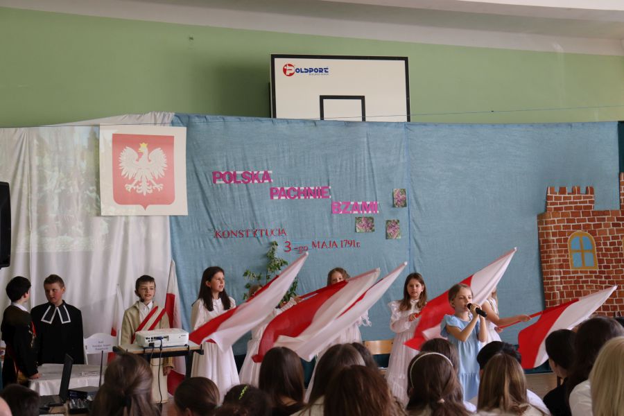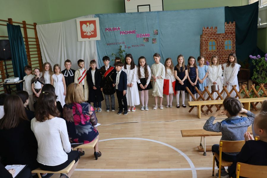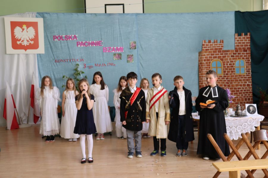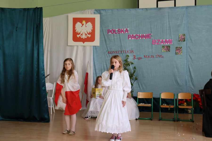 W dniu 28 kwietnia uczniowie klasy drugiej zaprezentowali montaż słowno – muzyczny z okazji Święta Konstytucji 3 Maja. Wśród bzów, kwiatów czeremchy i śpiewu ptaków, uczniowie zebrali się, by dać wyraz wspomnieniu tego ważnego dnia i pozwolić, by koledzy i koleżanki, a także widzowie zgromadzeni w sali gimnastycznej, wzbudzili w sobie refleksję nad naszymi dziejami… Udało się? Chyba tak. Kiedy wspomniano ten ważny moment, a z głośników płynął tekst preambuły, publiczności kręciły się łzy w oczach, ponieważ to, co mamy najcenniejszego, najpiękniejszego jest właśnie w nas i na tej ziemi, która nazywa się Polską…