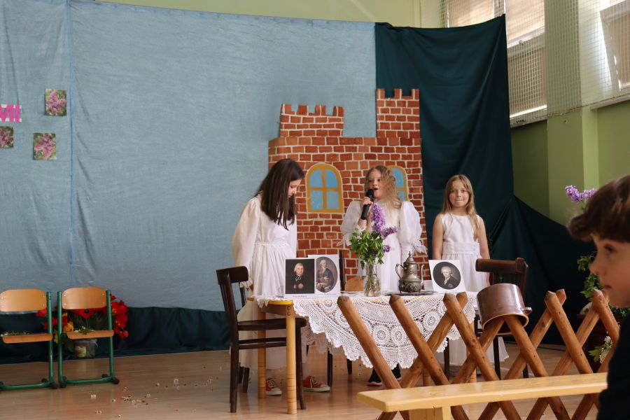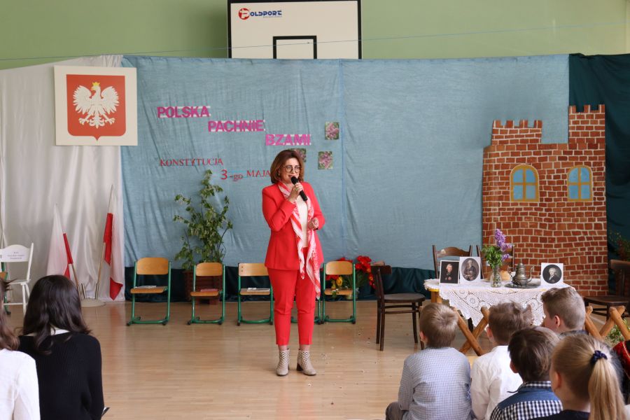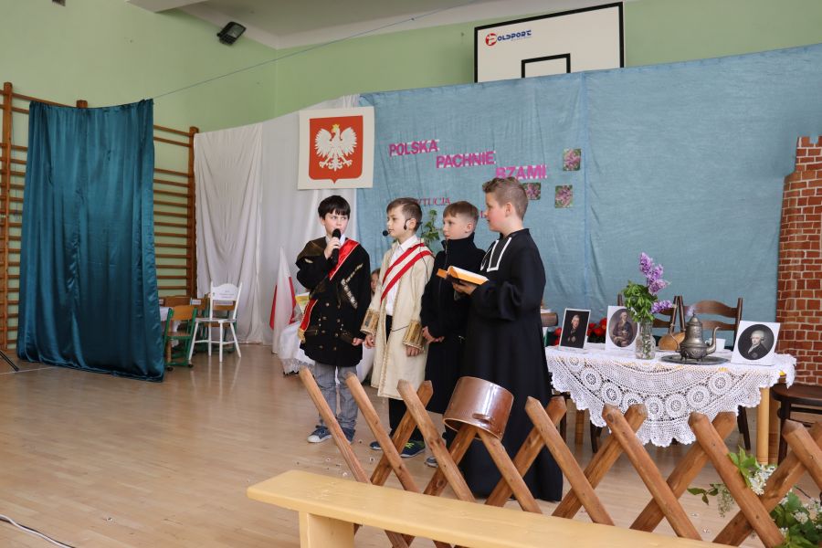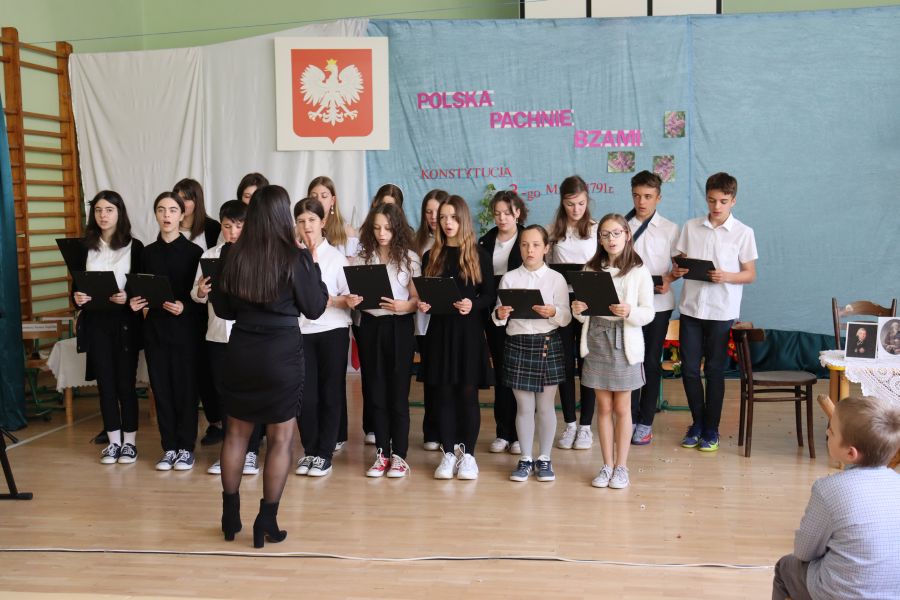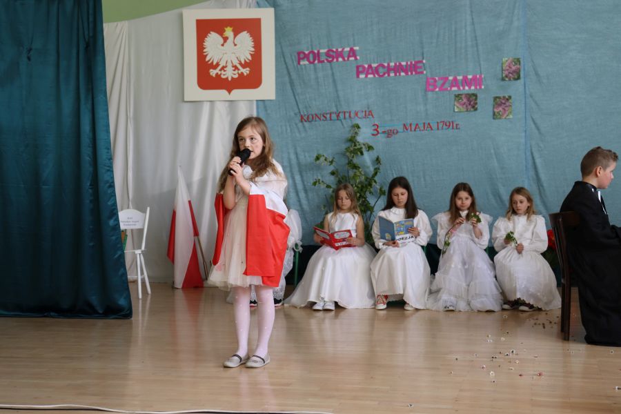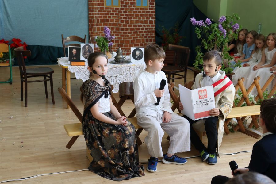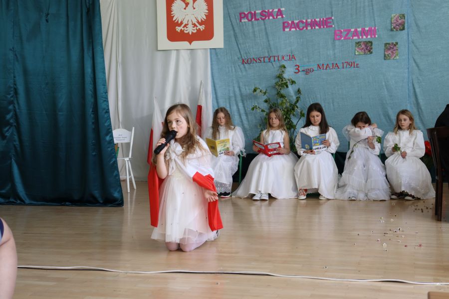 W dniu 28 kwietnia uczniowie klasy drugiej zaprezentowali montaż słowno – muzyczny z okazji Święta Konstytucji 3 Maja. Wśród bzów, kwiatów czeremchy i śpiewu ptaków, uczniowie zebrali się, by dać wyraz wspomnieniu tego ważnego dnia i pozwolić, by koledzy i koleżanki, a także widzowie zgromadzeni w sali gimnastycznej, wzbudzili w sobie refleksję nad naszymi dziejami… Udało się? Chyba tak. Kiedy wspomniano ten ważny moment, a z głośników płynął tekst preambuły, publiczności kręciły się łzy w oczach, ponieważ to, co mamy najcenniejszego, najpiękniejszego jest właśnie w nas i na tej ziemi, która nazywa się Polską…
