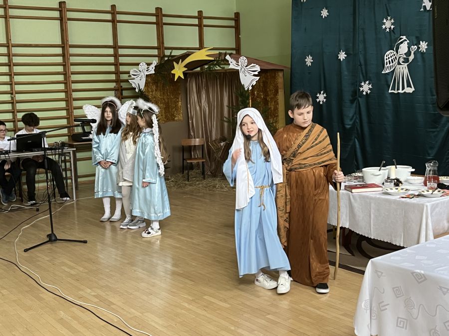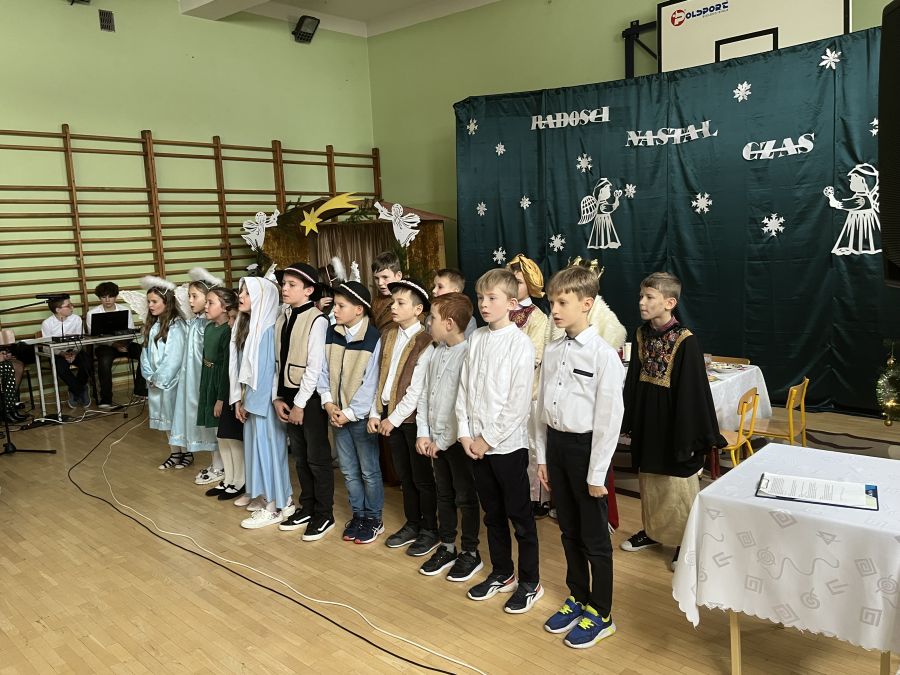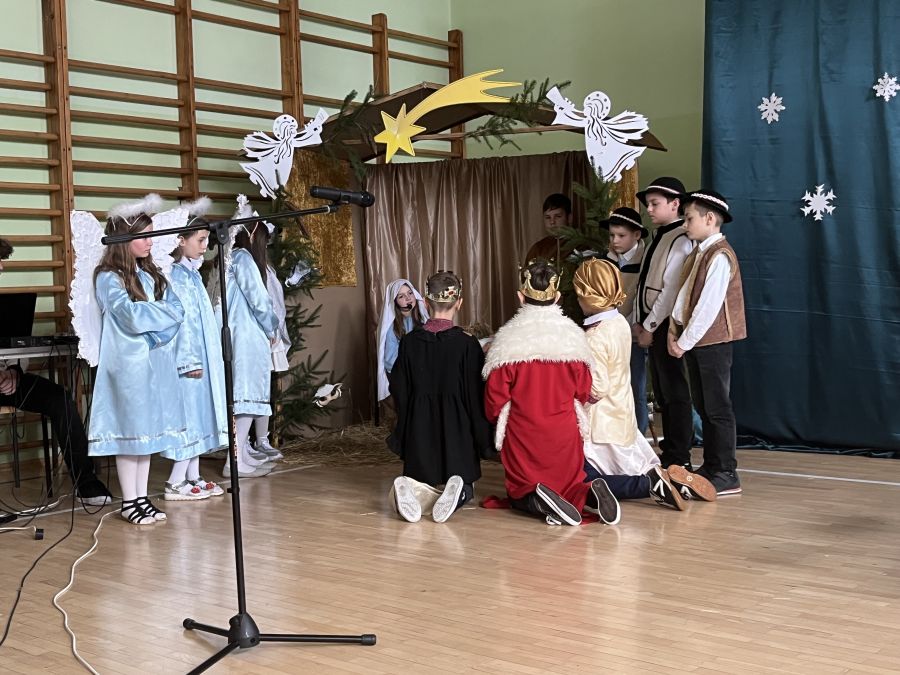 Uczniowie klasy III w bożonarodzeniowej scenerii zaprezentowali jasełka "Radości nastał czas…". Przedstawienie to pokazało polską tradycję Bożego Narodzenia, poprzedzonego dniem wigilijnym. Dzieci z wielkim przejęciem i zaangażowaniem odegrały swoje role. Przypomniały wszystkim sceny rozgrywające się w stajence betlejemskiej, tułaczkę Maryi i Józefa, pokłon pasterzy, monarchów oraz polskiej rodziny. Umiejętności recytatorskie, cudownie zaśpiewane kolędy i pastorałki zrobiły na wszystkich bardzo duże wrażenie.