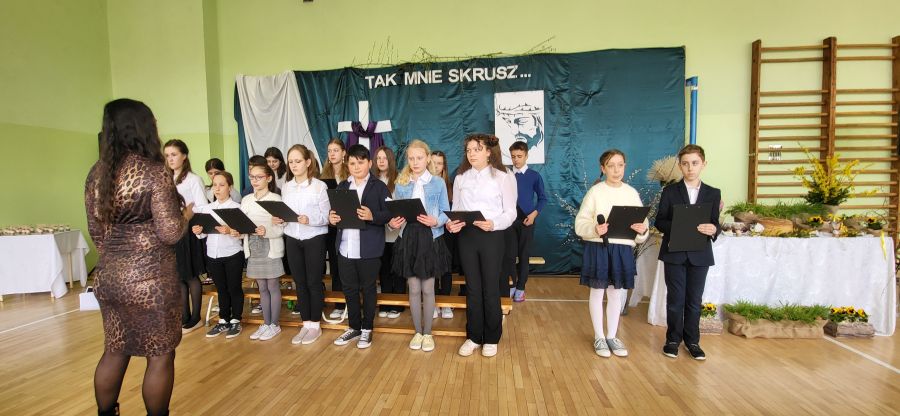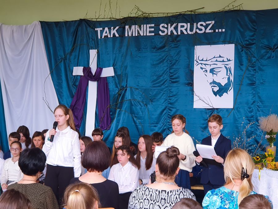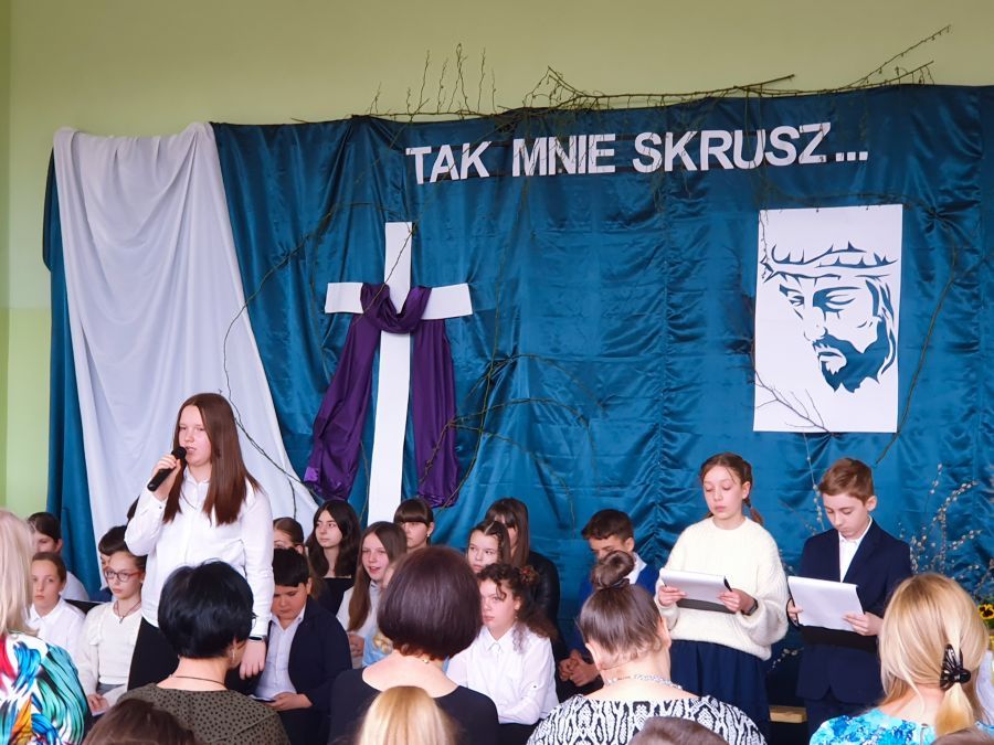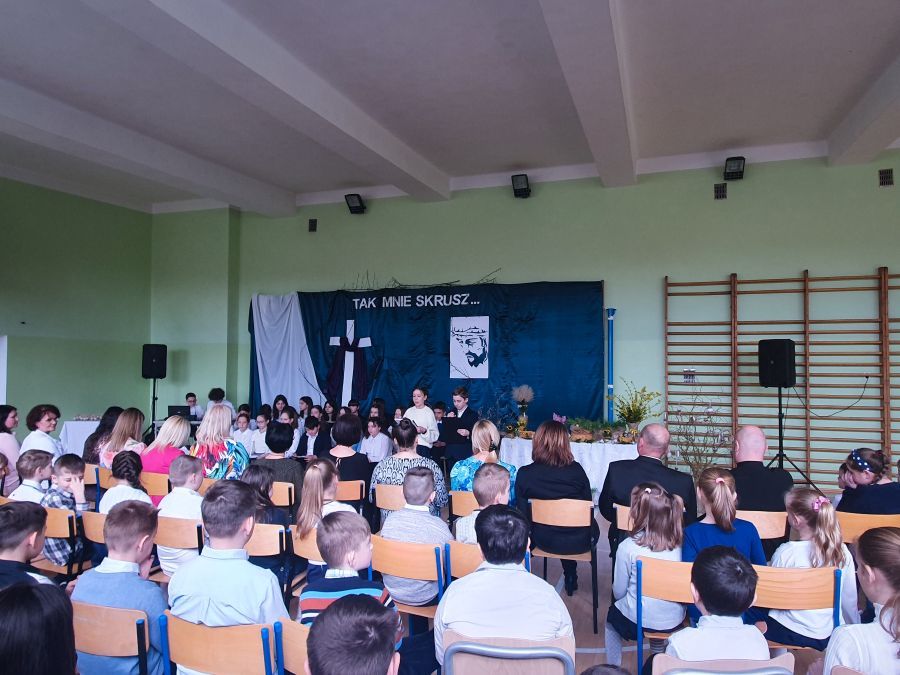 W duchowe przygotowanie do obchodów Świąt Wielkiej Nocy wprowadzili w dniu 5 kwietnia nauczycieli, uczniów i pracowników szkoły uczniowie klasy V i VI. Program słowno-muzyczny przygotowali pod kierunkiem wychowawców pani Joanny Nosal i pani Anety Motyki. Podczas występu pięknie recytowali wiersze, ukazując sens najważniejszych świąt w całym roku liturgicznym.
