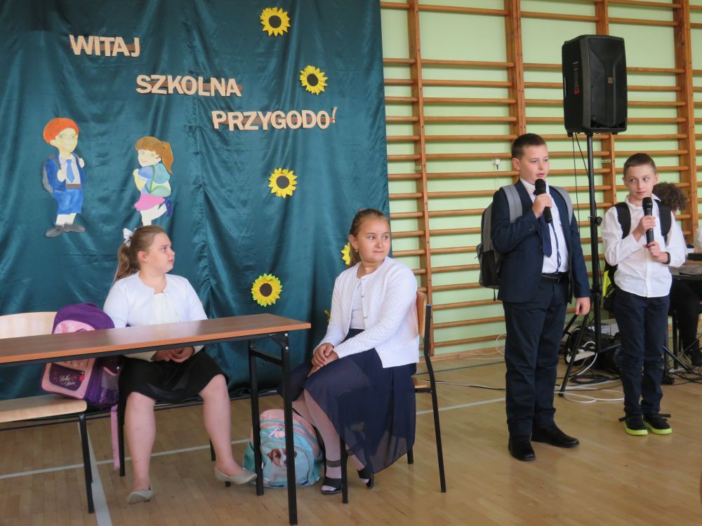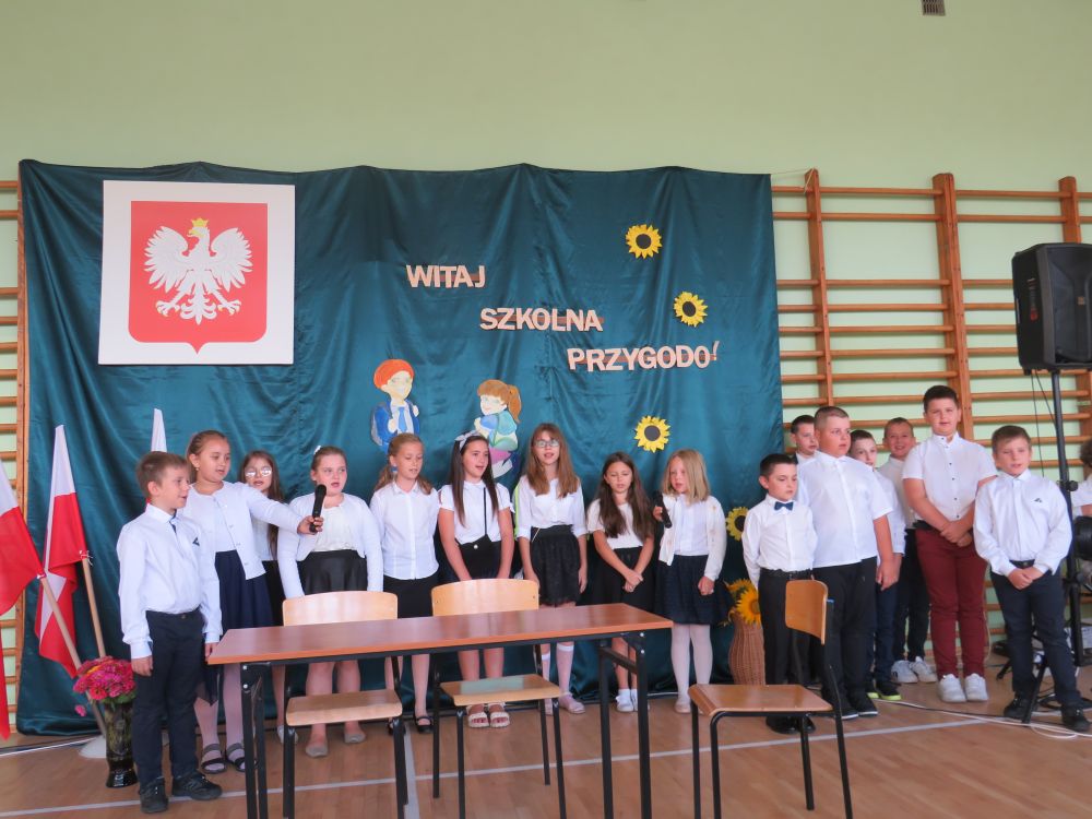 Zgodnie z ceremoniałem w obecności sztandaru szkolna społeczność odśpiewała hymn państwowy. Uczniowie klasy czwartej przygotowani przez Krystynę Holik i Renatę Wantuch zaprezentowali inscenizację "Witaj, szkolna przygodo!" Minutą ciszy uczczono ofiary drugiej wojny światowej.