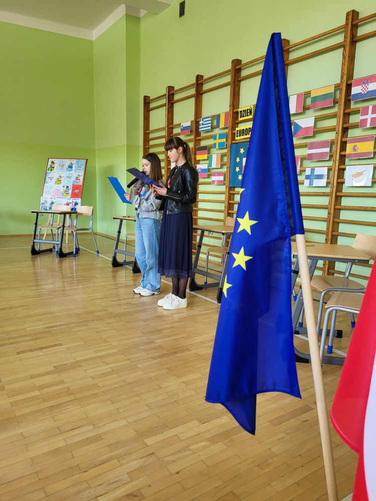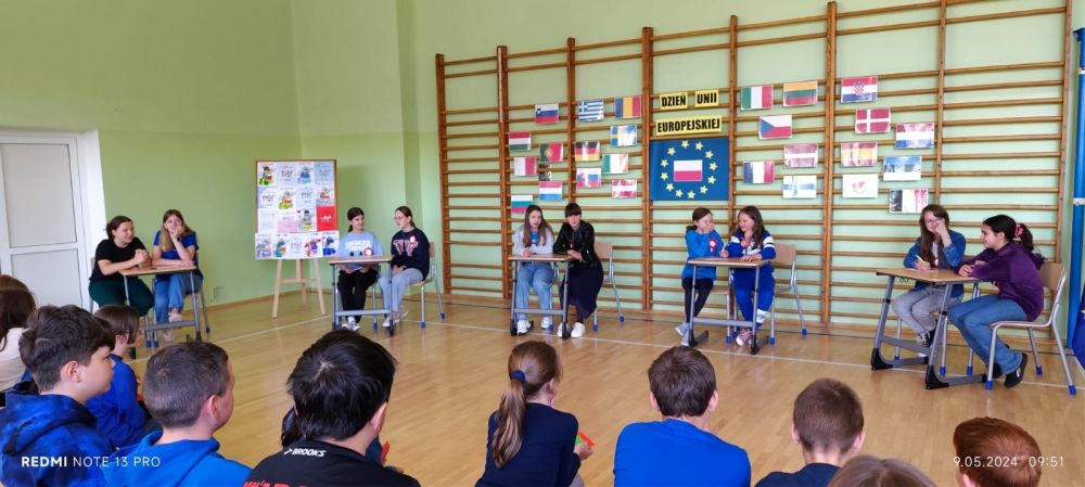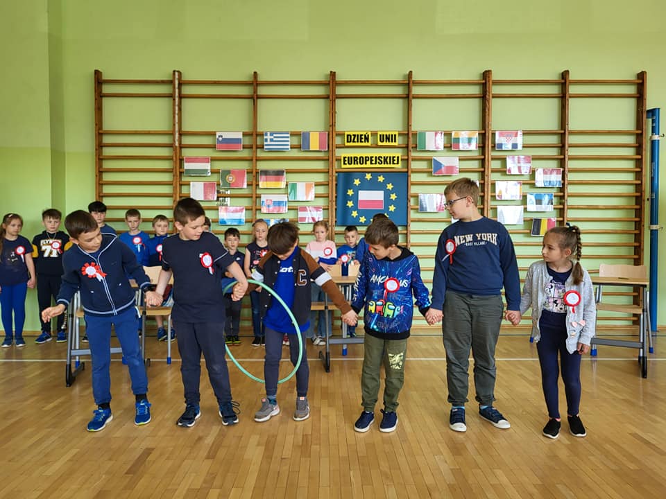 Każda z aktywności została tak zaprojektowana, aby przez ruch i interakcję angażować uczestników w kreatywny sposób, rozwijając ich wiedzę i zainteresowanie różnorodnością kulturową naszego kontynentu. "Kreatywne kolorowanki": Syriusz, gwiaździsta flaga, wykreślanki wyrazowe i okolicznościowe plakaty pozwoliły na utrwalenie symboli UE poprzez zaangażowanie artystyczne. "Flagowe zamieszanie" i "Melodyczne podróże" w dynamiczny sposób wprowadziły elementy geografii i muzycznych hymnów. Quizowe zadania "Euro-ciekawostek" w wyjątkowo humorystyczny sposób utrwaliły wiedzę o językach, stolicach, walucie, specyficznych atrakcjach krajów członkowskich. Nawiązaniu interakcji z publicznością służyło rozpoznawanie zdań Prawda-Fałsz. Gorące słowa podziękowań kierujemy do pań: B. Kudławiec, J. Cieśli, I. Adamczyk-Szury, które zadbały o rzetelne punktowanie aktywności uczniowskich. Zabawy sprawnościowe oraz sondaż społeczny "Co wiem o Polsce i UE" rozwinęły umiejętności społeczne, komunikacyjne i pracy zespołowej, równocześnie promując idee jedności i współpracy, które są fundamentami Unii Europejskiej.