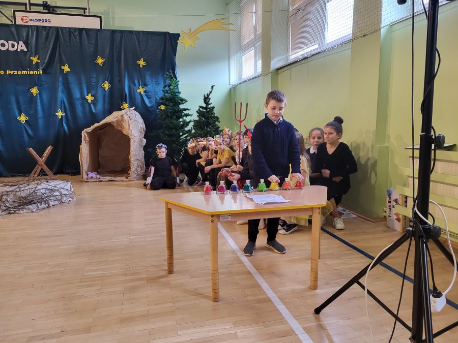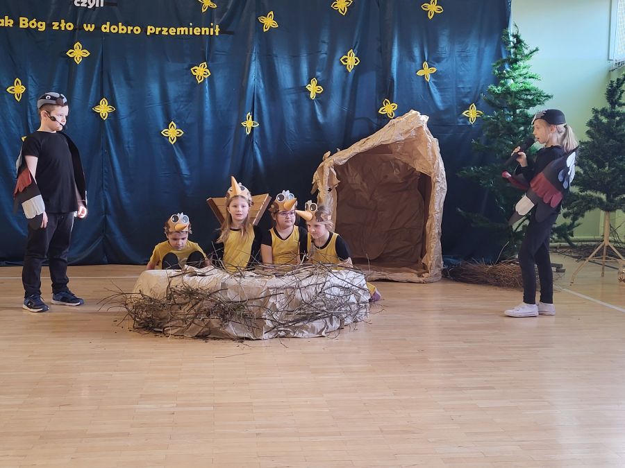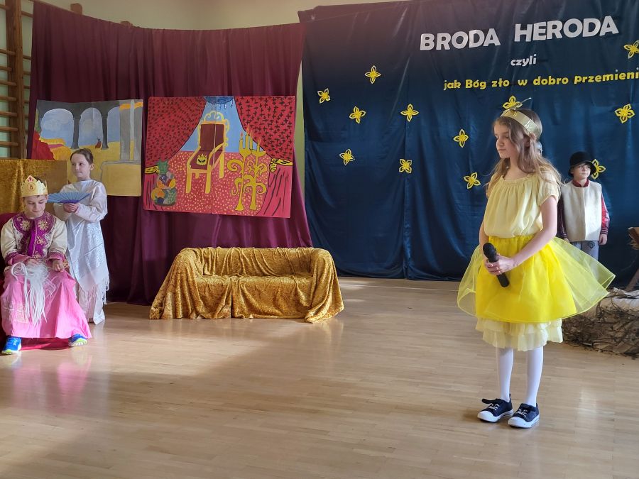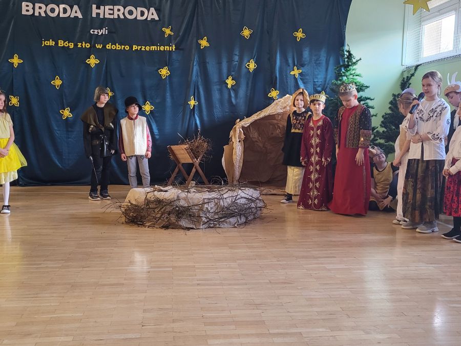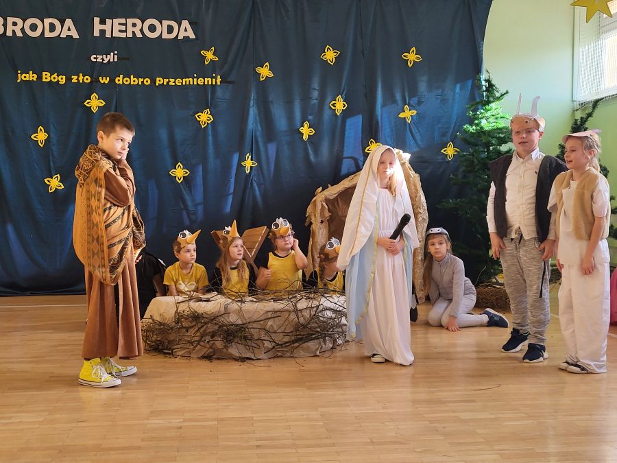 4 stycznia w sali gimnastycznej naszej szkoły zapanowała magiczna atmosfera. Stało się to za sprawą dźwięków kolędy wygrywanej na dzwonkach przez ucznia kl. I Karola Zająca. Następnie wystawione zostało przedstawienie "Broda Heroda, czyli o tym, jak Bóg zło w dobro przemienił". Obok postaci Maryi, Józefa, Aniołów, Diabłów i Pasterzy wystąpiły także zwierzęta: osiołek, owieczki. W przedstawieniu szczególną rolę odegrała pewna ptasia rodzina. Jej losy w niesamowity sposób, także za sprawą brody Heroda, skrzyżowały się z przeżyciami Świętej Rodziny. W tej opowieści Herod coś stracił, ptaszki i ludzkość zyskały, a Bóg zło w dobro przemienił. Uczniowie z klasy II i III wykazali się znakomitą grą aktorską, umiejętnościami recytatorskimi i wokalnymi. Ta wzruszająca, a zarazem pełna humoru opowieść, zawierała w sobie ważne przesłanie dla widzów: "Dobro zwycięża zło".