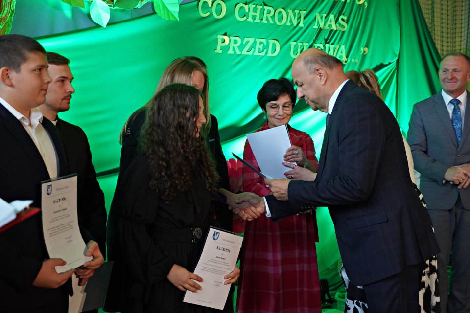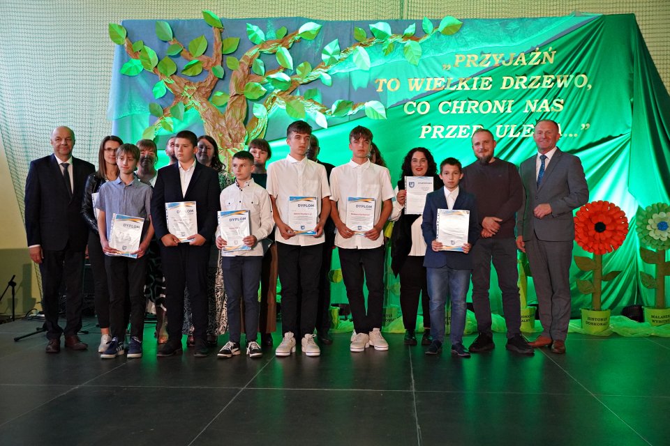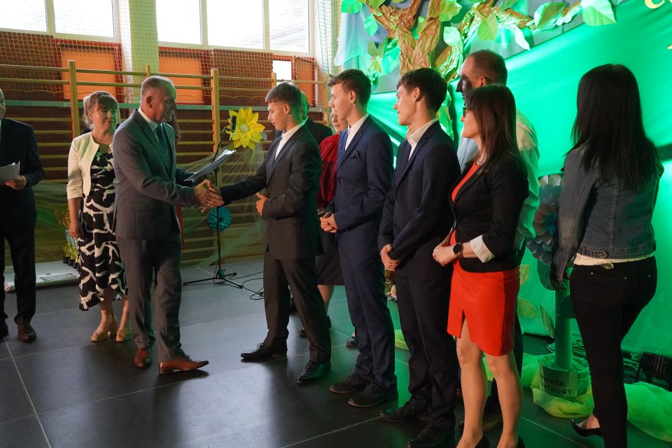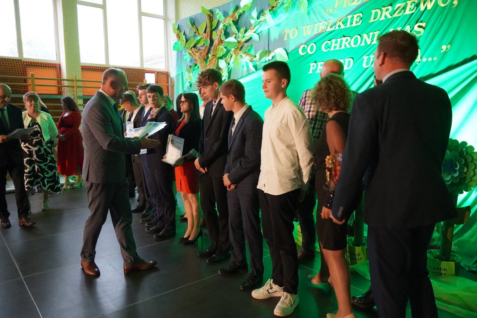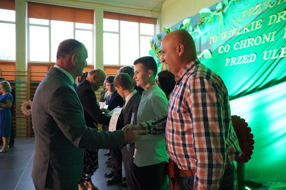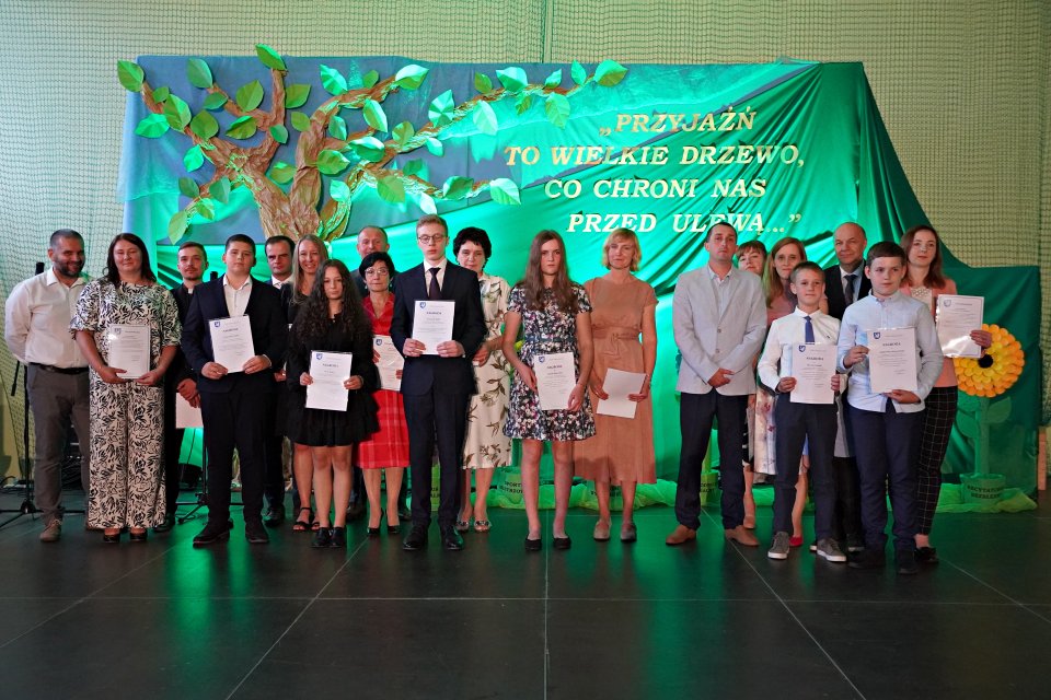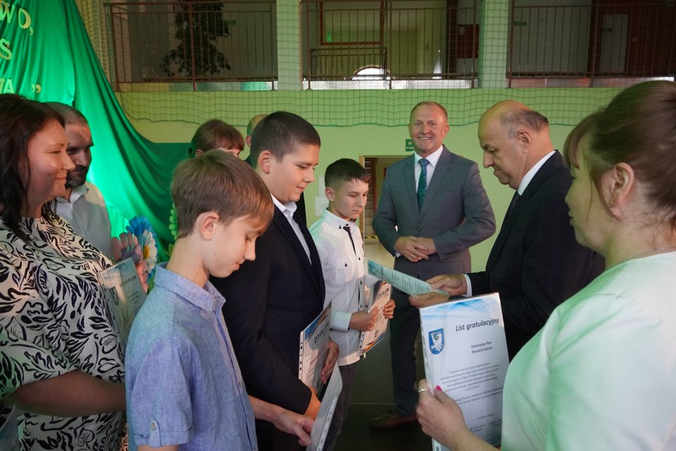 Gmina Gorlice już po raz dziewiąty nagrodziła wyróżniających się uczniów i po raz dziewiąty nasza szkoła mogła pochwalić się liczną reprezentacją. Uroczystość odbyła się we czwartek 13 czerwca br. w Zespole Szkolno-Przedszkolnym w Kwiatonowicach. Z rąk Jana Przybylskiego, wójta Gminy Gorlice, Mieczysława Skowrona, przewodniczącego Rady Gminy oraz Agaty Cup, dyrektora Oświatowego Zespołu Ekonomiczno-Administracyjnego nagrody odebrali uczniowie klasy ósmej: Franciszek Ciapaj - finalista konkursu biblijnego, Beata Kamyk – laureatka II miejsca konkursu historycznego, Krzysztof Kukla - finalista konkursu historycznego oraz Marcel Niziołek i Adam Wierzchanowski uczniowie klasy czwartej, Jagoda Bukowska uczennica klasy siódmej. Za wojewódzkie i powiatowe sukcesy sportowe nagrody odebrali: Filip Augustyn, Franciszek Ciapaj, Paweł Falisz, Wiktor Fejklowicz, Filip Kamiński, Gabriel Kucharczyk, Mateusz Kucharczyk, Marcin Uszko, Kacper Wilk, Gabriel Ryba, Bartłomiej Wadas, Wiktor Wantuch. Obok uczniów na estradzie stanęli dumni rodzice oraz ich merytoryczni opiekunowie: Małgorzata Stępień, ks. Michał Gądek oraz Ryszard Jamro.