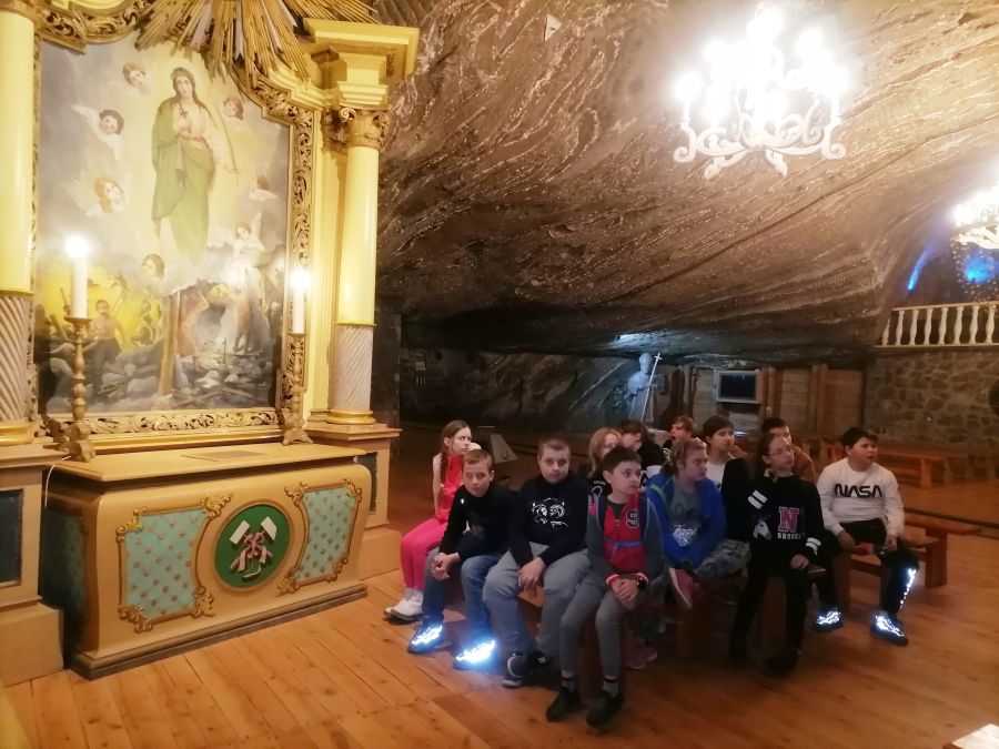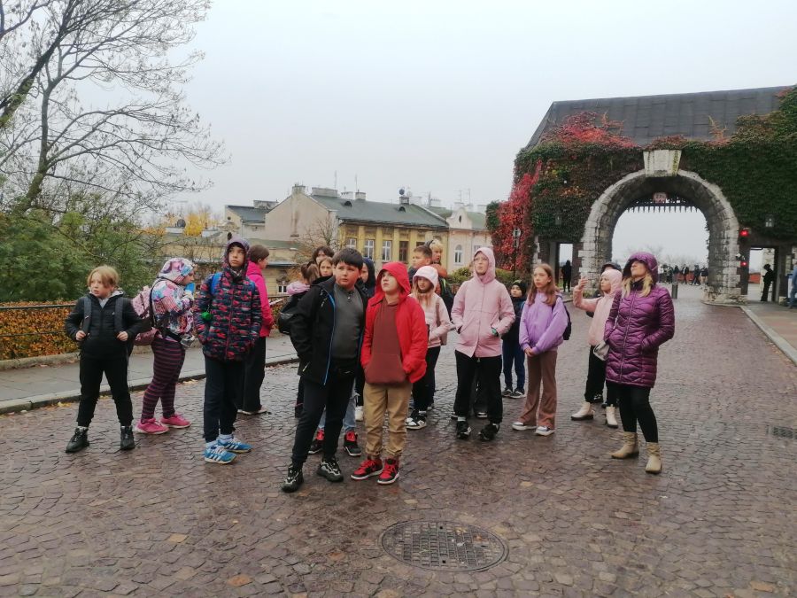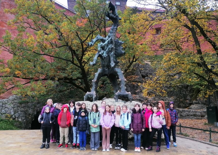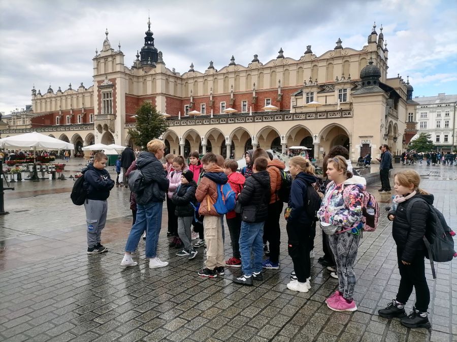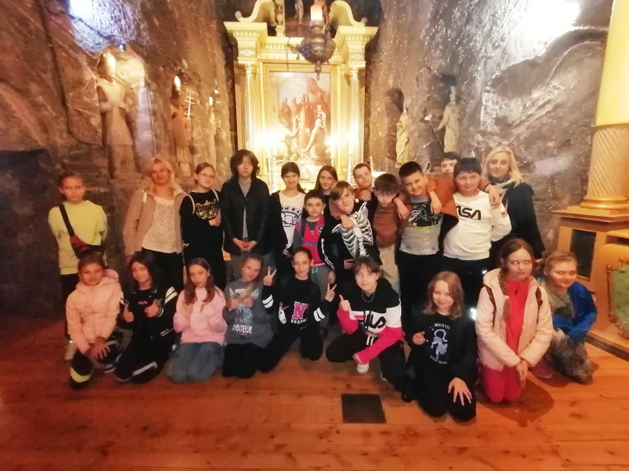W dniach 26 i 27 października 2023 r. uczniowie klasy VI, V, IV i III pod opieką wychowawców, pani Joanny Nosal i pani Krystyny Holik, udali się na dwudniową wycieczkę do Krakowa i Bochni. W pierwszym dniu trafiliśmy do Stołecznego Królewskiego Miasta Krakowa, gdzie przez średniowieczną Bramę Floriańską dotarliśmy do Rynku Głównego, Sukiennic, Collegium Maius. W godzinach popołudniowych udaliśmy się do Bochni. Tam w Muzeum Motyli ,,Arthropoda" mieliśmy okazję uczestniczyć w niecodziennej lekcji przyrodniczej. Ciekawe okazy motyli z całego świata urzekły nas swoją niezwykłością, różnorodnością barw. Następnie skorzystaliśmy z tężni solankowej przy Plantach Salinarnych i udaliśmy się na obiadokolację. Kolejnym punktem naszej wycieczki była wizyta w Kopalni Soli w Bochni. Po zjeździe pod ziemię windą górniczą, przejażdżce pociągiem i zakwaterowaniu pod opieką przewodnika wyruszyliśmy na zwiedzanie trasy turystycznej z podziemną ekspozycją multimedialną. W tym miejscu poznaliśmy historię Bochni, odkryliśmy tajniki pracy górników, zapoznaliśmy się z legendą dotyczącą życia i działalności św. Kingi, patronki górników solnych. W podziemiach, na głębokości 212 metrów, czekały na nas kolejne atrakcje, boisko do gry w piłkę nożną i koszykówkę oraz nocna dyskoteka. Po wyczerpującym i pełnym emocji dniu noc spędziliśmy w kopalni, wykorzystując lecznicy mikroklimat tego miejsca. Następnego dnia, tuż po śniadaniu, udaliśmy się do Krakowa, by przejść traktem królewskim, zwiedzić Wawel, ujrzeć Smoka Wawelskiego. Zwieńczeniem naszej wędrówki była wizyta w Żywym Muzeum Obwarzanka. W tym miejscu odkryliśmy tajniki produkcji obwarzanka. Dowiedzieliśmy się o jego tradycji i wypieku. Każdy z uczestników warsztatów miał możliwość zrobienia własnego obwarzanka. Uczniowie po zajęciach warsztatowych otrzymali dyplom czeladnika obwarzanka krakowskiego. Te dwa dni na długo pozostaną w naszej pamięci.