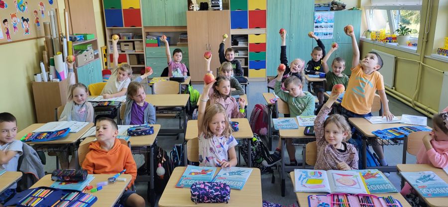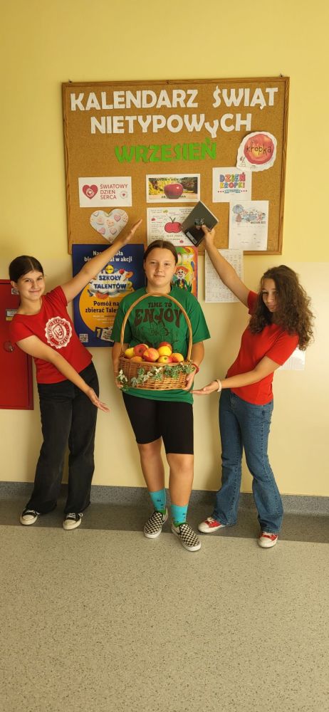 Dnia 28 września już po raz drugi obchodziliśmy w naszej szkole "Światowy Dzień Jabłka". Uczennice z Samorządu Uczniowskiego przygotowały krótkie informacje na temat właściwości jabłek, ich odmian, upraw oraz dlaczego powinno się je jeść ze skórką. Przypomniały również, że owoce przed spożyciem należy umyć. Przekazywanie tej wiedzy było urozmaicone różnymi zabawami i konkursami.