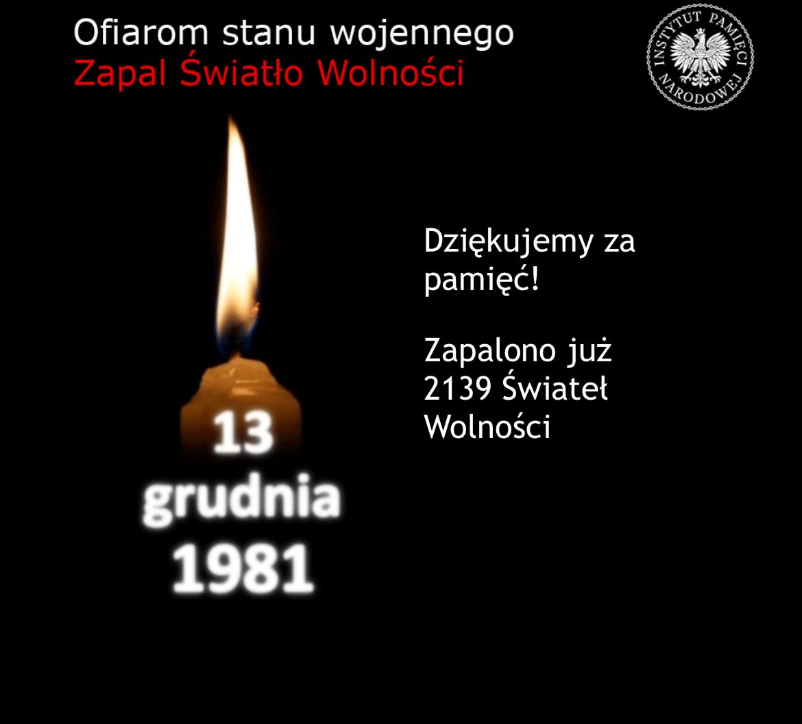 Dnia 13 grudnia 2023 roku minęła 42. rocznica wprowadzenia stanu wojennego w Polsce. Zapalając światło wolności, zarówno rzeczywiste w naszych oknach, jak I klikając w wirtualną świeczkę, uczciliśmy pamięć ofiar stanu wojennego, poległych w starciach z milicją, śmiertelnie pobitych na komisariatach, internowanych, a także, zwykle zapominanych, zmarłych z powodu braku opieki medycznej. Cześć Ich pamięci!