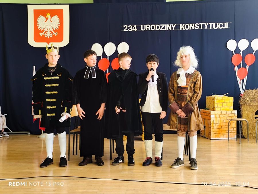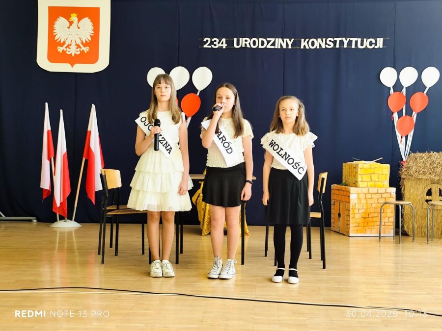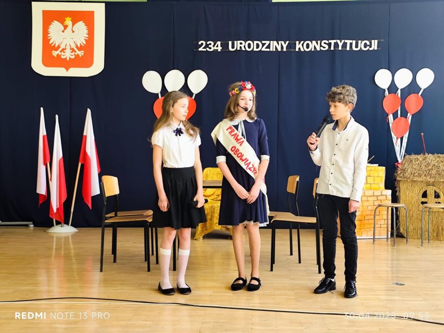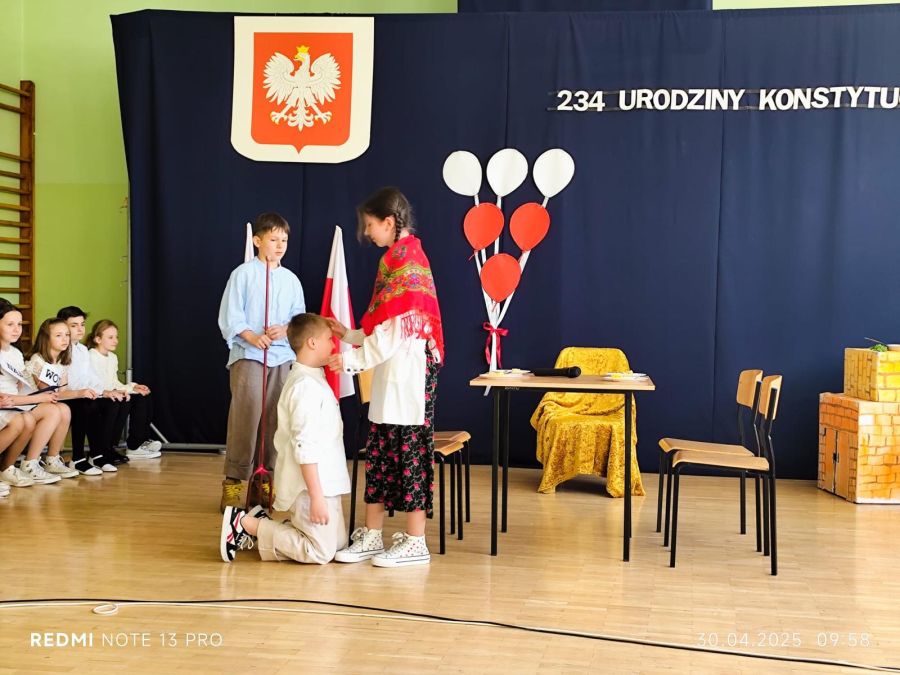 W środę 30 kwietnia uczniowie klas czwartej i piątej odegrali porywające widowisko z Konstytucją w roli głównej. Z bogatej, ale trudnej historii Polski, przybliżyli te fragmenty, dzięki którym Polacy dziś cieszą wolnością i równością, mają swój własny dom. Zawdzięczają to tym, którzy stawiali dobro państwa na pierwszym miejscu, również tym, którzy musieli przelewać krew. W najtrudniejszym XVIII wieku postępowi Polacy uchwalili pierwszą w Europie, a drugą na świecie "Ustawę Rządową", która dowartościowała Wolność, Naród, Ojczyznę. To ważne sprawy dla każdego. Kolejna rocznica jest okazją do refleksji, pamięci, odpowiedzialności każdego pokolenia za utrzymanie suwerenności. Wolnym jest ten, co żyje w wolnym kraju.