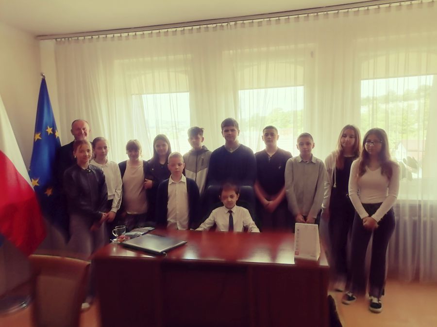 Dnia 30 maja br. uczniowie klasy VI udali się do Urzędu Gminy Gorlice, gdzie ich kolega, Szymon Dąbrowski, w nagrodę za zajęcie I miejsca w konkursie literackim „Pędzlem i piórem o tej, która sercu najbliższa”, na kilka godzin przejął obowiązki Wójta. Spotkanie to stanowiło również okazję, by dowiedzieć się, na czym polega praca Wójta oraz Przewodniczącego Rady Gminy, poznać specyfikę pracy, zakres obowiązków urzędników gminy. Młodzież podczas wizyty miała okazję poznać nowe środowisko pracy, porozmawiać z pracownikami, zgłębić wiedzę o zawodach i kompetencjach zatrudnionych w tej instytucji osób. Na spotkanie z młodzieżą przebyła także Pani Agata Cup – pełnomocnik wójta ds. oświaty, która po raz kolejny była pomysłodawcą gminnego konkursu literacko - plastycznego oraz inicjatorem obchodów Dnia Dziecka.