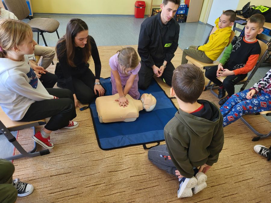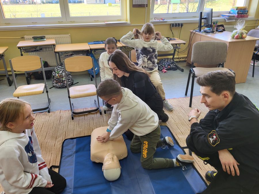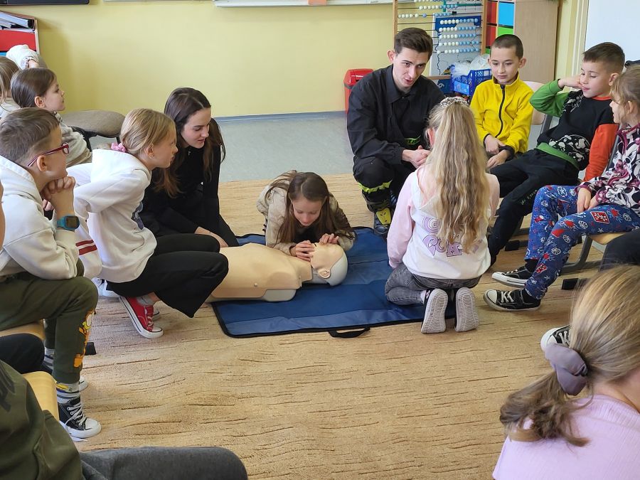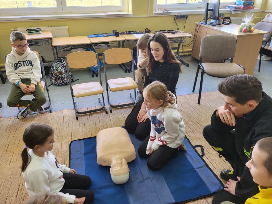Pokazali uczniom pięć zasad postępowania podczas udzielania pomocy poszkodowanym w wypadkach samochodowych. Absolutnym atutem tego spotkania były indywidualne ćwiczenia z fantomem. Pod czujnym okiem strażaków dzieci przeprowadzały resuscytację poszkodowanego. Można było zaobserwować wielkie zaangażowanie uczniów. Celem tych zajęć jest jest wykształcenie poczucia odpowiedzialności za siebie i innych, uwrażliwienie na krzywdę drugiego człowieka, a przede wszystkim zaszczepienie idei niesienia bezinteresownej pomocy.