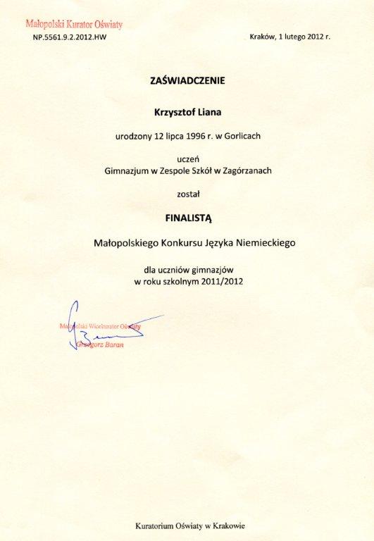 Krzysztof Liana - uczeń kl. III b Gim. dostarczył nam szczególnych powodów do radości i dumy. Już po raz drugi zdobył tytuł finalisty Małopolskiego Konkursu Języka Niemieckiego dla uczniów gimnazjów województwa małopolskiego. Nad rozwojem ucznia uzdolnionego czuwa mgr Karina Szura, nauczycielka j.niemieckiego oraz j.angielskiego.