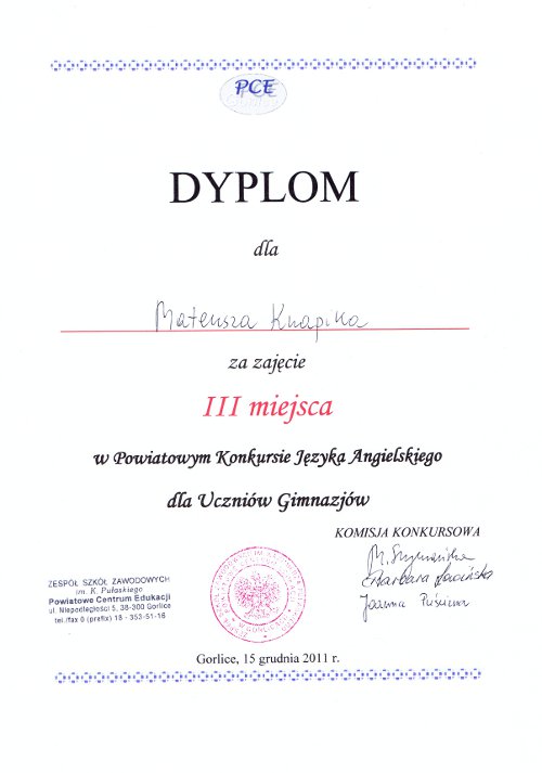 Dnia 15 grudnia 2011 roku w Powiatowym Centrum Edukacji w Gorlicach odbył się Powiatowy Konkurs Języka Angielskiego pt. „Wiedza o Nowej Zelandii”. W konkursie tym wzięło udział 17 uczniów z naszego powiatu. Naszą szkołę godnie reprezentowali uczniowie klasy drugiej gimnazjum: Monika...