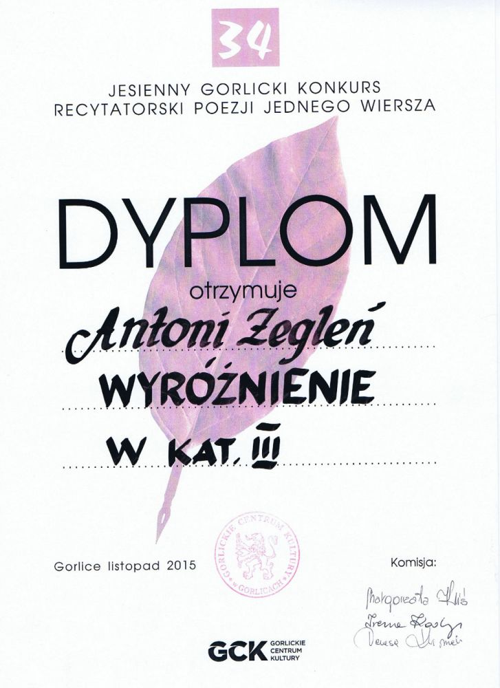 W dniach 25 i 26 listopada 2015 roki w Gorlickim Centrum Kultury odbył się Jesienny Gorlicki Konkurs Recytatorski Poezji Jednego Wiersza. Z naszej szkoły w kategorii szkół podstawowych udział wzięły trzy osoby, natomiast gimnazjum jedna uczennica. Konkurencja była olbrzymia - szkołę podstawową reprezentowało 66 uczestników, gimnazjum 40. Młodzi...