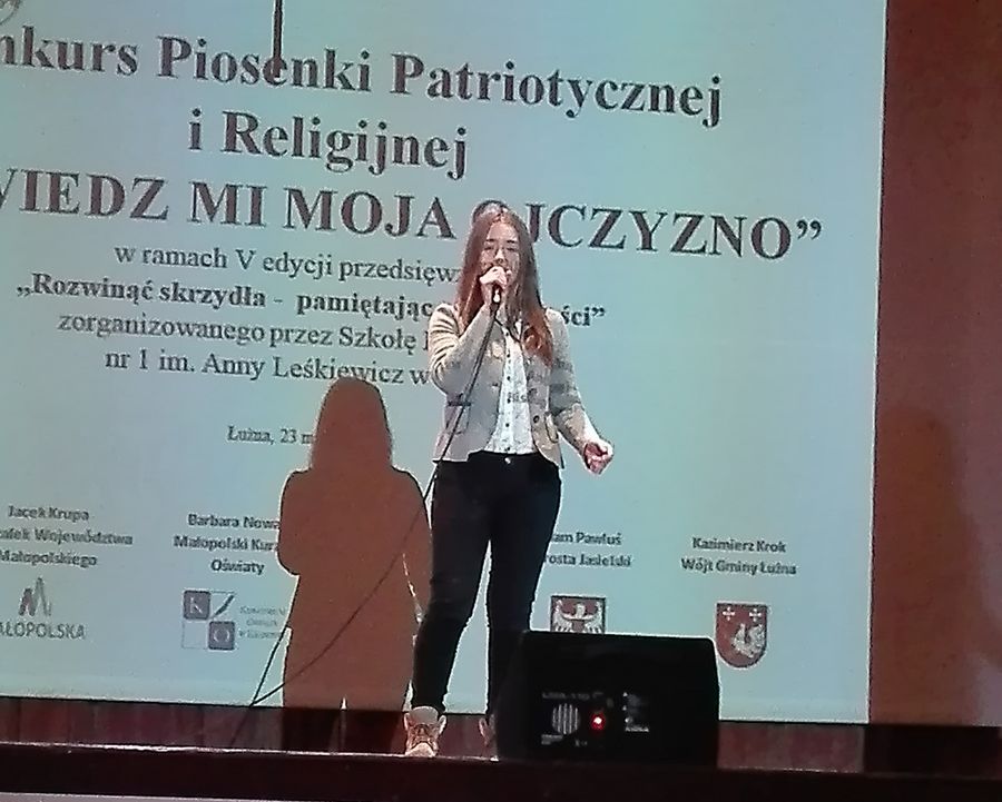 Dnia 23 marca 2018 roku w Gminnym Ośrodku Kultury w Łużnej w ramach V edycji przedsięwzięcia „Rozwinąć skrzydła - pamiętając o przeszłości”, odbył się konkurs piosenki patriotycznej oraz religijnej. Naszą szkołę reprezentowali: Amelia Pyrcioch z kl. VII, która zaprezentowała piękną pieśń patriotyczną „Tango, na głos, orkiestrę i jeszcze jeden głos” Magdalena Biernacka z kl. VII z piosenką „Jak orzeł co w locie zgasł” oraz Antoni Żegleń z kl. IIG w piosence „Kocham wolność”. Uczniowie zaprezentowali się bardzo dobrze, a poziom był naprawdę wysoki. Dziękujemy za godną reprezentację naszej szkoły.