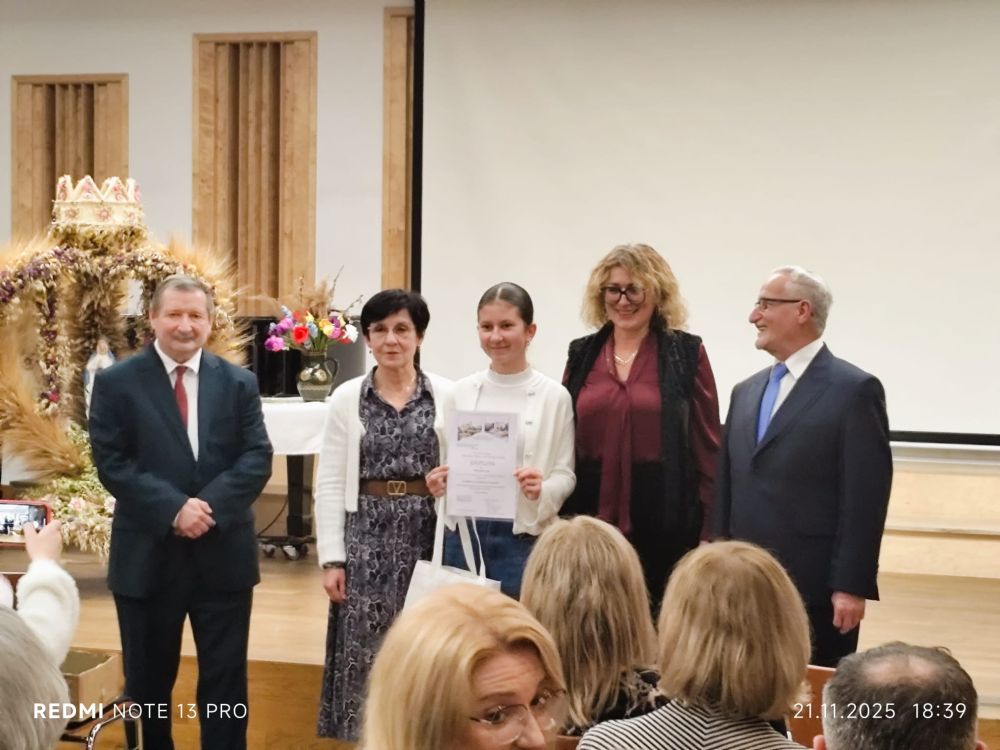 Bardzo szczęśliwy okazał się dla nas piątek 21 listopada br. Maja Bukowska z kl. VI została laureatką I miejsca, a Weronika Uszko z kl. V odebrała wyróżnienie. W auli Zespołu Państwowych Szkół Muzycznych odbył się finał konkursu powiatowego "Znam Moje Miasto, Znam Ziemię Gorlicką". W XXXI edycji Stowarzyszenie Miłośników Ziemi Gorlickiej zaproponowało uczniom temat: "Jakie tradycje ludowe kultywowane są do dziś na Ziemi Gorlickiej?" Weronika w etapie międzyszkolnym otrzymała wyróżnienie za pracę "Czerwone korale" poświęconą strażniczkom ludowych obrzędów, czyli członkiniom KGW. Maja w finale przedstawiła własny projekt "Zeby mamuny nie miały do chołpy przystympu." Wierzbowymi witkami otworzyła przed publicznością drzwi do dawnego świata tradycji i obrzędów związanych z przygotowaniem palmy wielkanocnej. Wykorzystała zdjęcia z rodzinnego albumu, własnoręcznie wykonane kwiaty z krepiny. Występ zakończyła piosenką. Jury doceniło oryginalność ujęcia tematu, autentyczność przekazu, piękny język wypowiedzi i swobodę sceniczną okraszoną czarującym uśmiechem. Dziewczyny odebrały dyplomy i cenne nagrody. Gratulujemy dziewczynom talentów, kreatywności i odwagi w podejmowaniu wyzwań. Dziękujemy za piękną promocję szkoły.