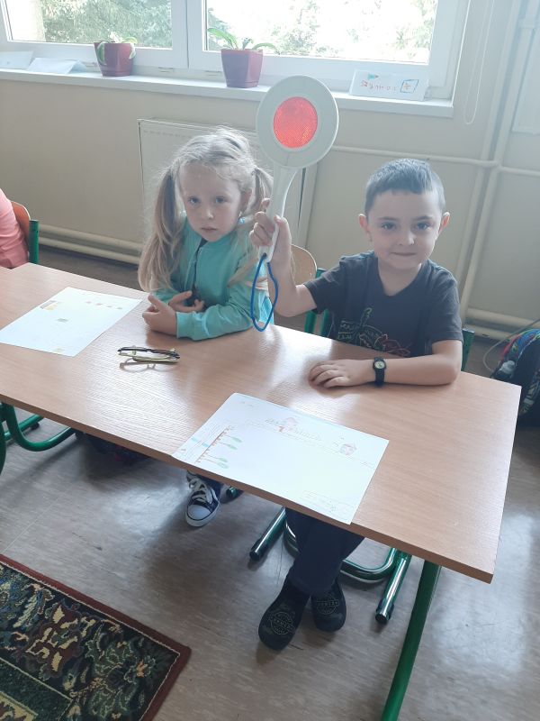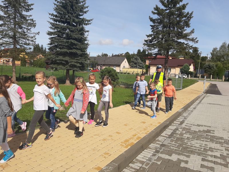 W naszej szkole duży nacisk kładziemy na bezpieczeństwo oraz edukację związaną z bezpieczeństwem dzieci. W dniu 11 września uczniowie klasy I uczestniczyli w spotkaniu z aspirantem sztabowym Pawłem Zawiślakiem – policjantem z Wydziału Ruchu Drogowego Komendy Powiatowej Policji w Gorlicach. Najmłodsze dzieci miały okazję porozmawiać o zachowaniu bezpieczeństwa w drodze do i ze szkoły, o bezpiecznym przechodzeniu przez ulicę, prawidłowym zachowaniu się na przejściach dla pieszych. Nasz Gość zwrócił uwagę na niebezpieczeństwa, jakie mogą czyhać na dziecko na drodze, omówił sposoby unikania lub pokonywania ich. Ponadto podkreślił, jak ważną rolę pełnią elementy odblaskowe. Dzieci odpowiadały na zadawane pytania, wykazały się wiedzą z zakresu bezpieczeństwa w ruchu drogowym, podawały liczne przykłady niewłaściwego zachowania się.