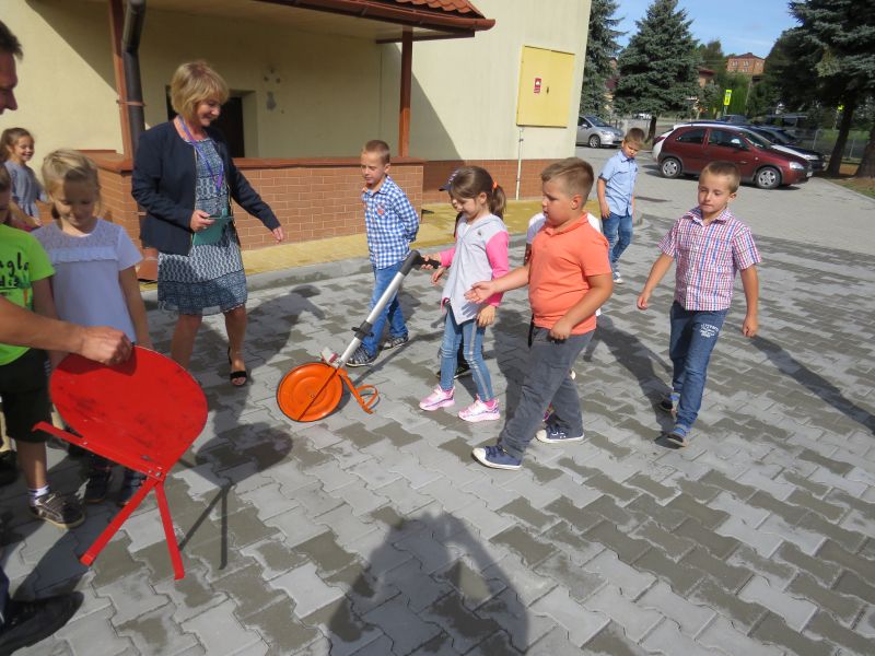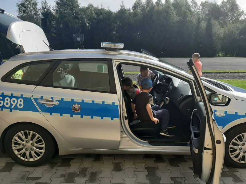 Poruszane tematy cieszyły się dużym zainteresowaniem wśród uczniów, o czym świadczyły liczne pytania kierowane do Policjanta. Następnie dzieci miały okazję zobaczyć przyniesione przez naszego gościa podstawowe akcesoria policjanta; lizak, kajdanki czy pałkę policyjną. Najprzyjemniejszą częścią spotkania było obejrzenie radiowozu policyjnego z jego wyposażeniem. Na zakończenie dzieci pod okiem policjanta ćwiczyły prawidłowe przechodzenie przez jezdnię.