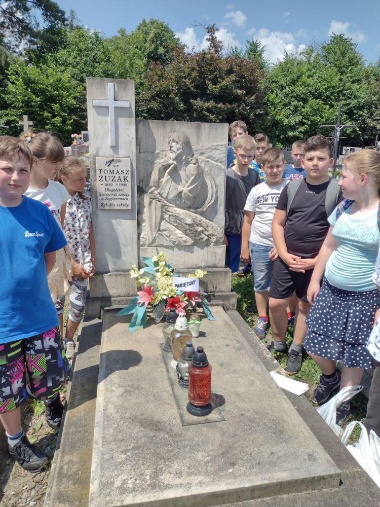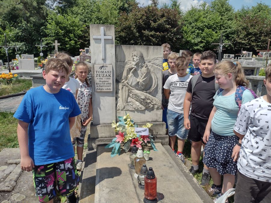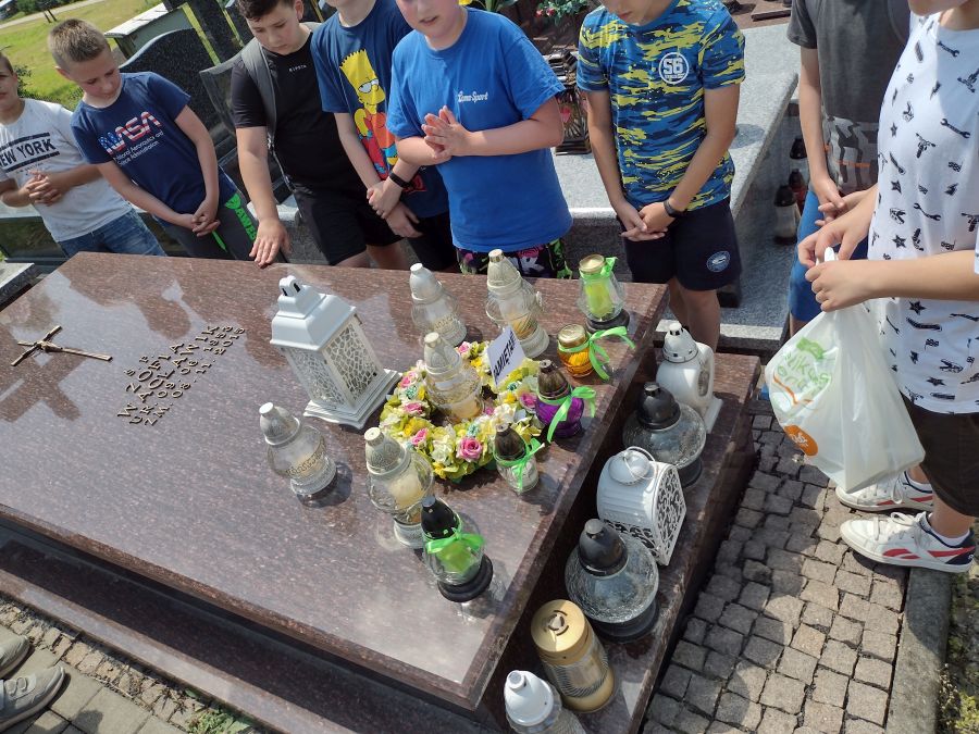 Uczniowie klasy piątej jeszcze jesienią zaplanowali inicjatywę "Pamiętamy o zmarłych nauczycielach". Niestety pandemia, zamknięcie szkół i cmentarzy przerwało zaawansowane przygotowania. Wróciliśmy do przerwanych prac. Z ozdobionymi zniczami i przygotowanymi chorągiewkami ruszyliśmy na cmentarz parafialny. Pamięć zmarłych nauczycieli uczciliśmy również chwilą modlitwy. Widoczne znaki z pewnością zwrócą uwagę innych, a młodszym pokoleniom wskażą, tych którzy dawno temu dbali o edukację ich rodziców i dziadków. Dla piątoklasistów była to wyjątkowa okazja sięgnięcia do szkolnego archiwum, kronik, galerii zdjęć, fotograficznych albumów oraz rozmów w rodzinach. Każda sylwetka nauczycieli, ale także księży katechetów i proboszczów stała się rozpoznawalna. W ten sposób budujemy dumę narodową, staramy się rozumieć wartość wolności, postaw odwagi i poświęceni, sensu pracy dla innych. Oni wszyscy kształtowali poprzednie pokolenia, trudzili się dla innych. To nasze wspólne dziedzictwo, zwłaszcza istotne dla lokalnej społeczności.