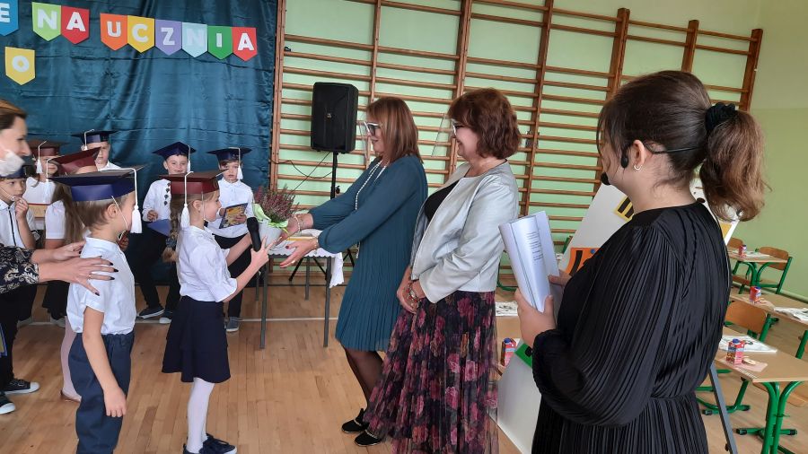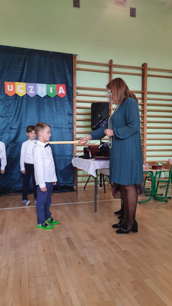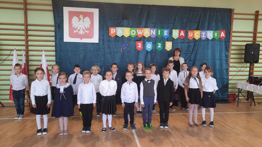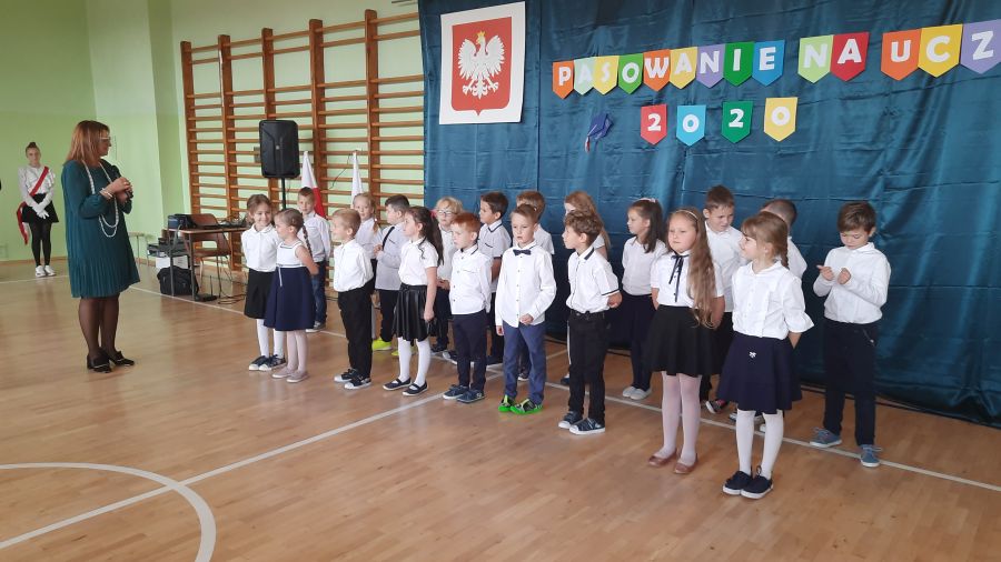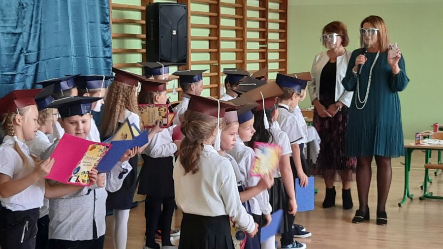 Następnie dyrektor szkoły pani Iwona Jamro za pomocą symbolicznego ołówka dokonała pasowania na Uczniów Szkoły Podstawowej im. Komisji Edukacji Narodowej oraz wręczyła dzieciom legitymacje szkolne. Natomiast wychowawczyni Marzena Nikiel wręczyła pamiątkowe dyplomy i nałożyła na głowy birety. Od tej chwili pierwszaki oficjalnie zostały przyjęte do braci uczniowskiej.