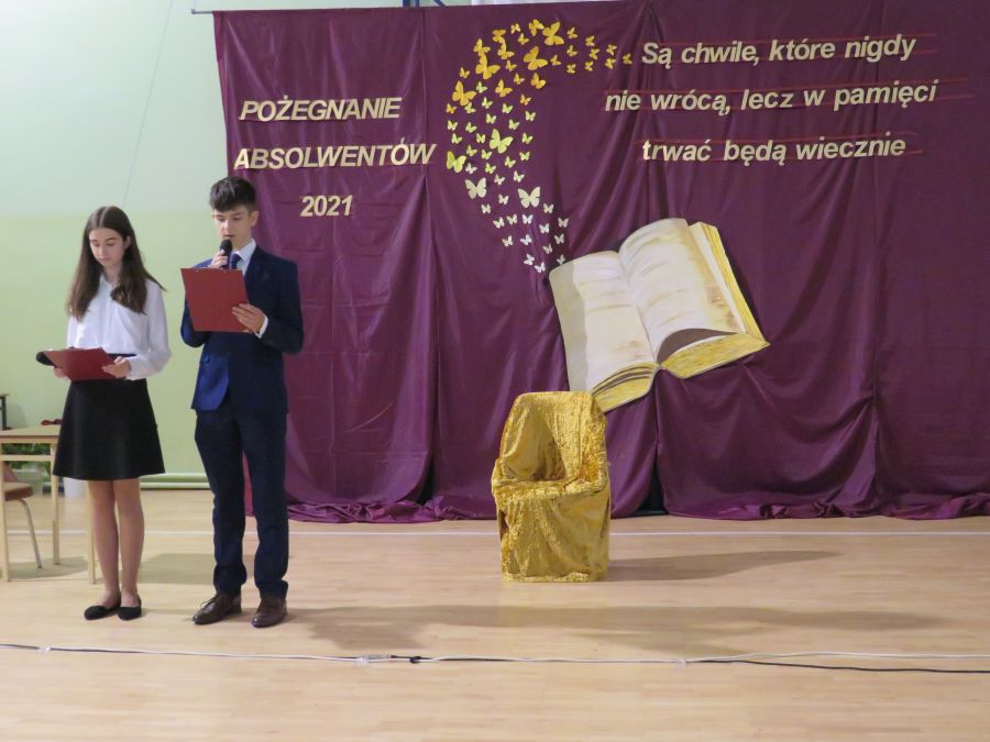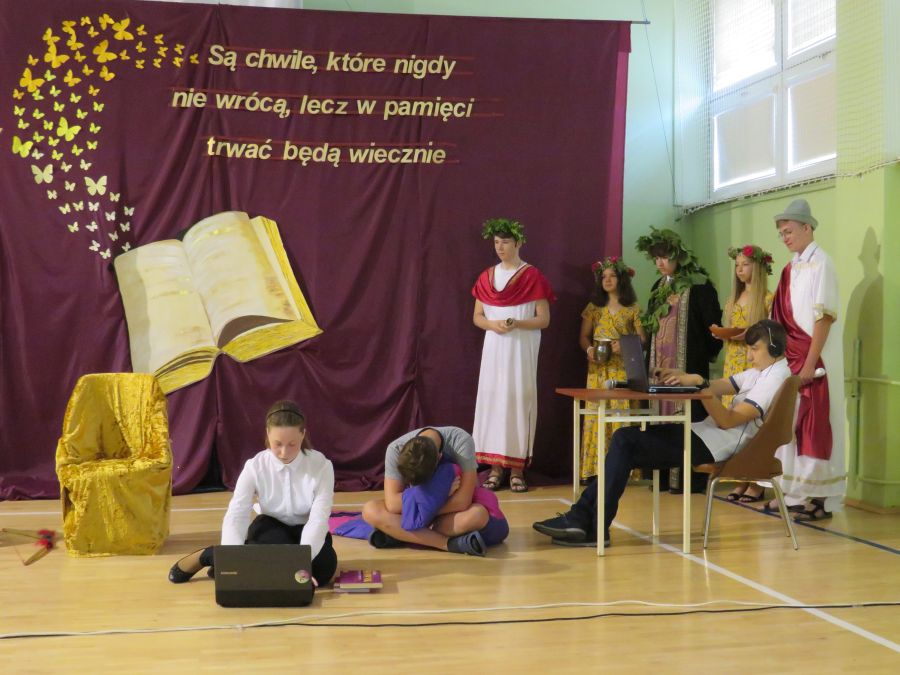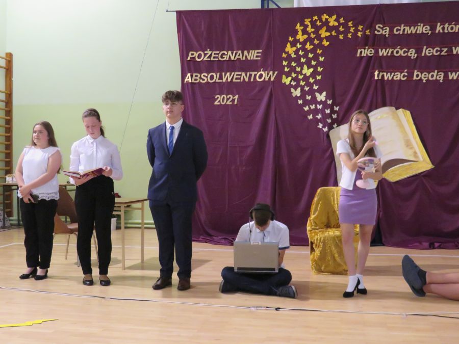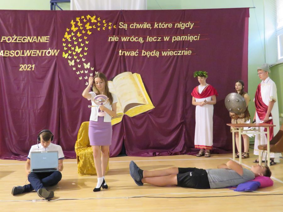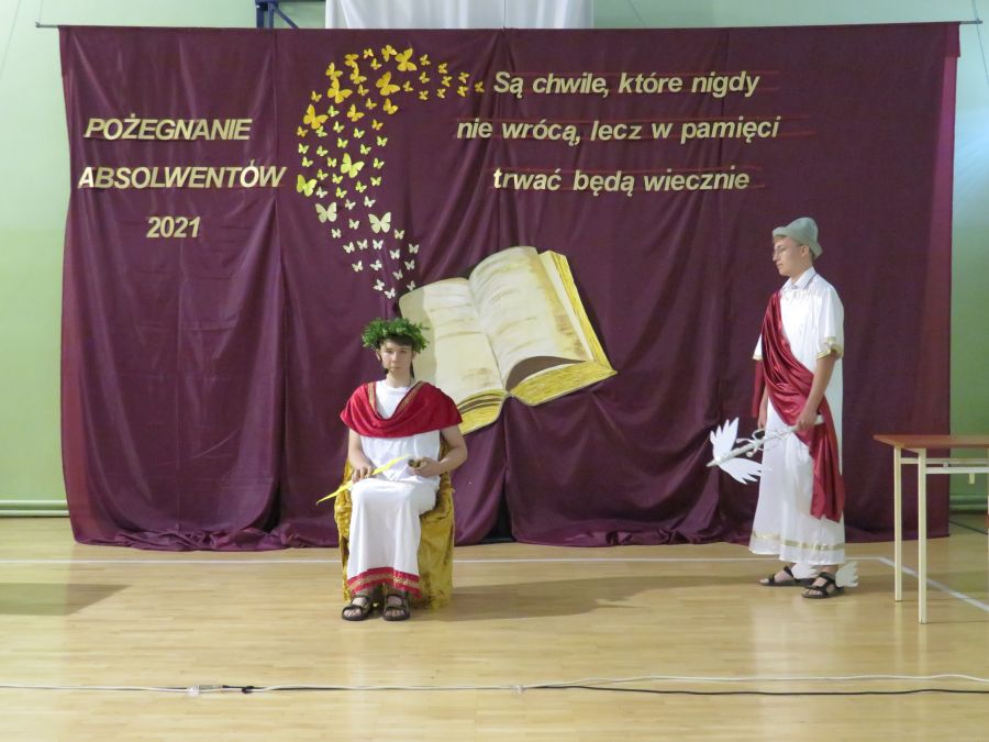 "Są chwile, które nigdy nie wrócą, lecz w pamięci trwać będą wiecznie", to słowa, które stanowiły myśl przewodnią programu artystycznego, jaki zaprezentowali uczniowie kończący szkołę podstawową. Absolwenci wrócili wspomnieniami do zdarzeń z minionych lat. Chcąc ukazać uczniowski los, udali się w olimpijskie progi, by złożyć skargę na trudny uczniowski byt. Niestety, zostali szybko zdemaskowani przez Gromowładnego, Atenę, Amora i Dionizosa, którzy ukazali Zeusowi ich prawdziwe oblicze, poczynania w czasie nauki stacjonarnej i zdalnej. Kiedy skruszeni uczniowie zapragnęli powrócić do szkoły, Zeus ogłosił wyrok. Zapragnął zamienić się miejscem z ósmoklasistami. W czasie występu młodzież zaprezentowała ciekawe typy uczniów, które wykreowały się w czasie pracy zdalnej. W humorystyczny sposób ukazała przebieg lekcji, które na zawsze pozostaną w ich sercach i pamięci.