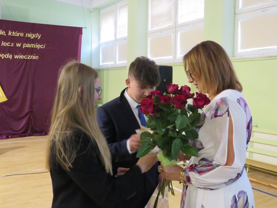 Na koniec absolwenci podziękowali Pani Dyrektor, nauczycielom i rodzicom za trud pracy włożony w ich wychowanie i nauczanie. Słowa wdzięczności skierowali również do pracowników obsługi, którzy na co dzień troszczyli się o to, by w szkole było czysto i bezpiecznie, by nie zabrakło ciepłych posiłków. Na czas letniego urlopu podarowali wszystkim pracownikom szkoły samodzielnie przygotowane "Niezbędniki", których zawartość ma zapewnić strudzonym pedagogom i pracownikom chwile wyciszenia, pomóc zregenerować nadwyrężone siły, osłodzić każdą chwilę życia. Scenografię przygotowali uczniowie klasy ósmej pod opieką wychowawczyni, pani Joanny Nosal.