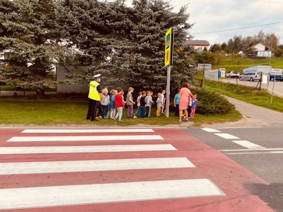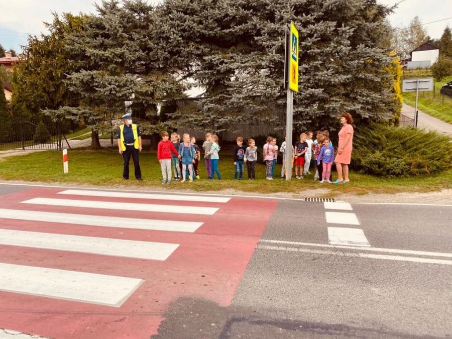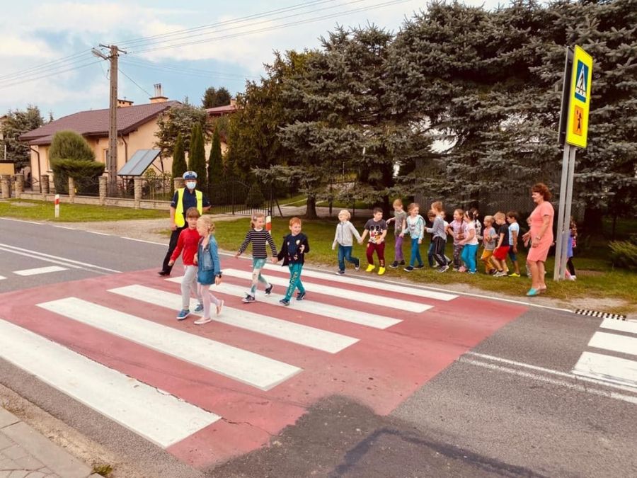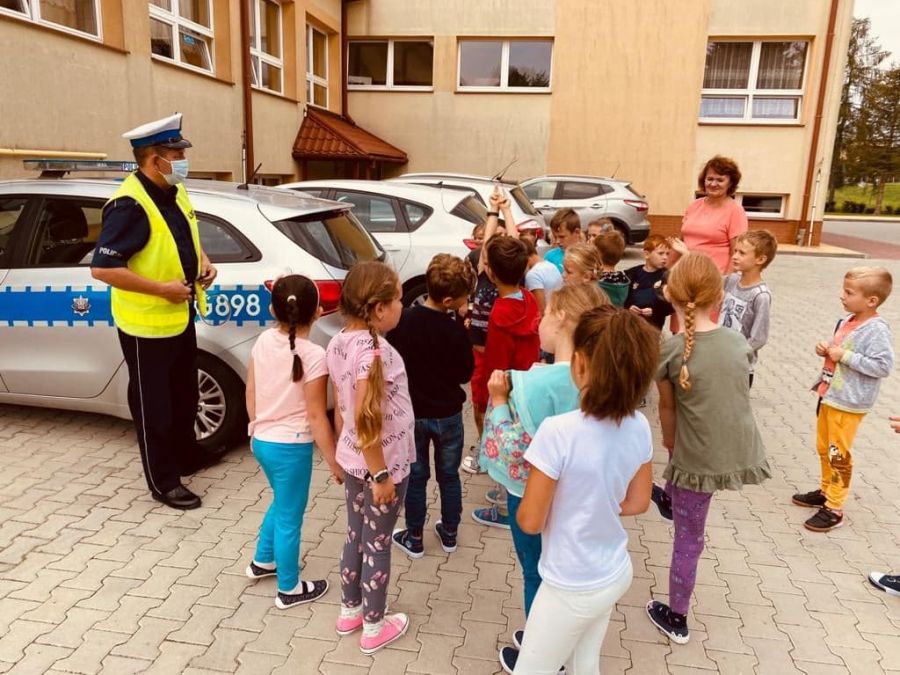 17 września uczniowie klasy I gościli u siebie policjanta. Głównym celem spotkania było zapoznanie dzieci z niebezpieczeństwami grożącymi im w trakcie drogi do i ze szkoły, uświadomienie jak prawidłowo należy korzystać z drogi oraz jak zachować się, gdy spotkają na swojej drodze obcą osobę. Rozmawialiśmy na temat konieczności przestrzegania przepisów ruchu drogowego, zasad bezpiecznego przechodzenia przez drogę, utrwaliliśmy znajomość niektórych znaków drogowych. Dzieci miały okazję dowiedzieć się również, na czym polega praca policjanta. Obejrzały mundur wraz z odznaką i czapką oraz sprzęt jest potrzebny podczas służby. Wszystkich zainteresowały policyjne kajdanki. Największą jednak atrakcją był radiowóz i jego wnętrze. Jednak ze względu na panującą pandemię nie mogły wsiąść do samochodu, czy zabawić się w policjanta i złodzieja. Najwięcej radości wzbudziło włączanie sygnałów alarmowych. To był dzień, który na długo pozostanie w pamięci dzieci.