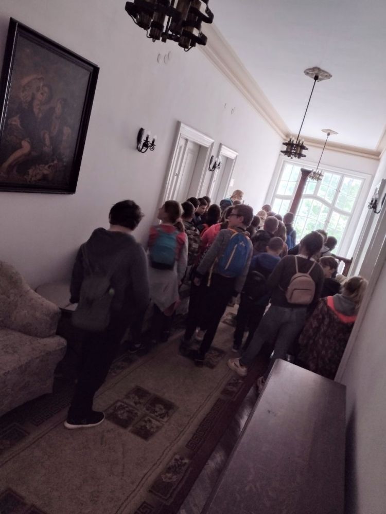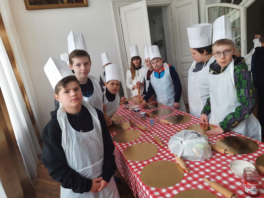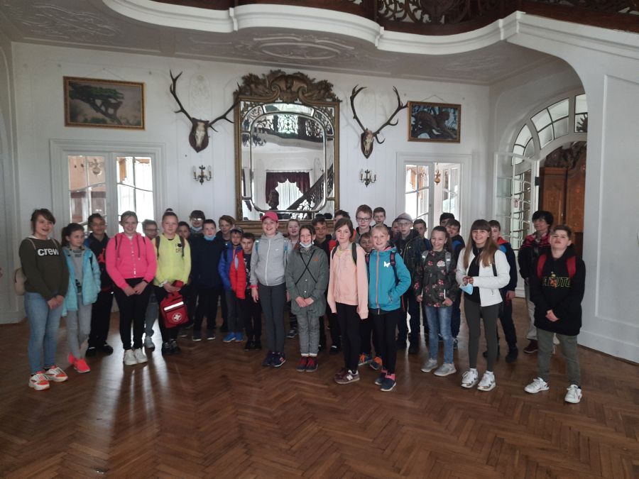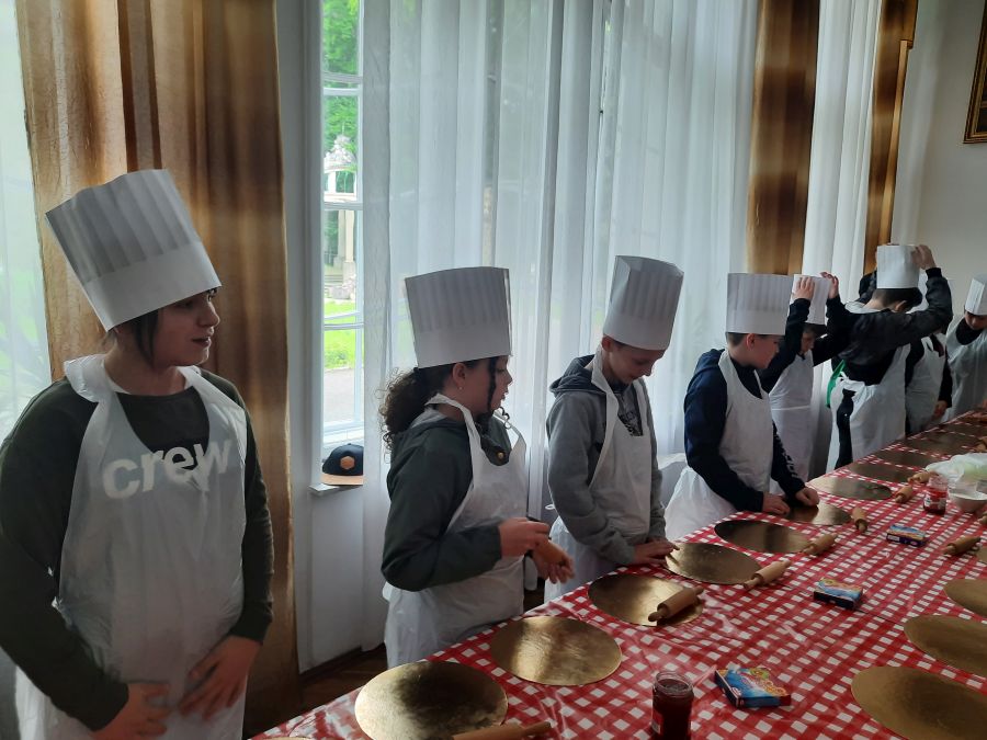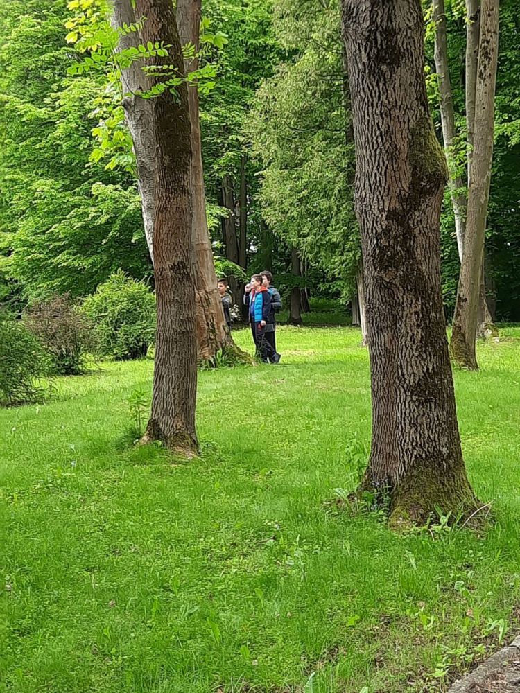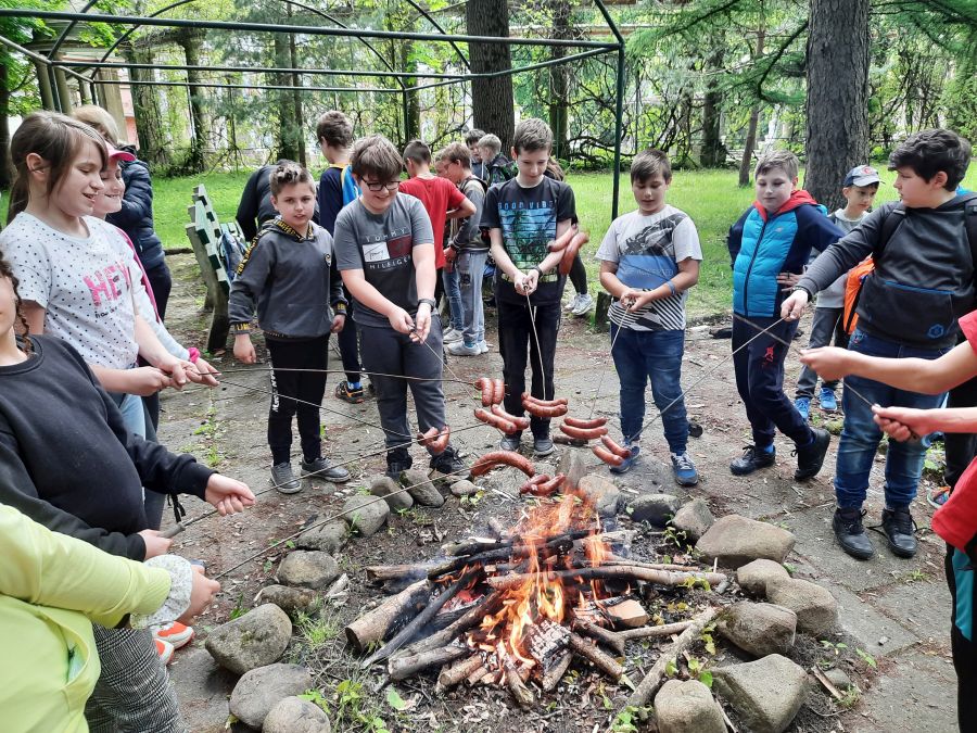 I wreszcie nadszedł ten dzień – Dzień Dziecka! Wychowawczynie klasy czwartej oraz piątej zabrały swoich podopiecznych do Pałacu w Siarach. Luksusowa rezydencja pioniera i potentata naftowego naszego regionu stała się miejscem warsztatów ciastkarskich. Każde dziecko wyposażone w fartuch i czapkę kucharską na swoim własnym stanowisku wałkowało, podsypywało i znów wałkowało bazę, aby wycinać różnorodne ciasteczka. Wypieki wróciły do autorów, którzy dekorowali z wykorzystaniem swojego kunsztu artystycznego. Były gwiazdeczki, kwiatuszki, zwierzątka, domki oraz kreatywne kształty własne. Własnoręcznie wykonane ciasteczka zachwycały kolorami, dodatkami, a przede wszystkim wyjątkowym smakiem. Następnie dzieci zwiedziły reprezentacyjne i prywatne pokoje naftowej arystokracji, podziwiały meble, wyposażenie, porcelanę, kryształowe lustra. Przekonali się jak dziś funkcjonuje obiekt. A potem… nadeszło to najbardziej zaskakujące – GRA TERENOWA. Osiem mieszanych drużyn odebrało mapę pałacowego parku i kartę zadań. Ważna była poprawność odpowiedzi, ale również liczył się czas wykonania. Zadania zaskoczyły wszystkich: szyfr, krzyżówka, hasło, trochę matematyki, trochę historii, trochę wiedzy ogólnej. Uff… nie było łatwo. Nad prawidłowym przebiegiem czuwały wychowawczynie oraz dzielna asystentka Ola. Grę ukończyli wszyscy i to z sukcesem. Pokonali trasę, rozwiązali zadania, pokonywali własne trudności, dotarli do mety. Najważniejszy cel został osiągnięty – była świetna zabawa. Kiedy dzieci kończyły zdanie: Dziś podobało mi się… , pojawiła się właściwie jedna odpowiedź: gra terenowa. Zwieńczeniem dnia było ognisko i pieczenie kiełbasek. Po ciężkim roku izolacji z ogromną przyjemnością dzieci cieszyły się własnym towarzystwem, dały upust emocjom, odnowiły pozytywne relacje, korzystały z ruchu na świeżym powietrzu. Panowała miła atmosfera i poczucie bezpieczeństwa.