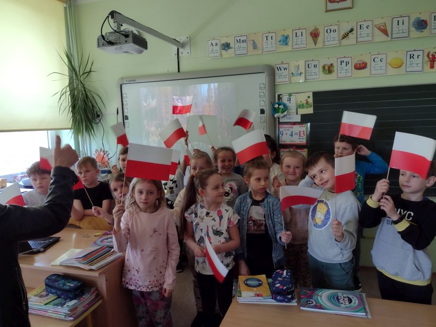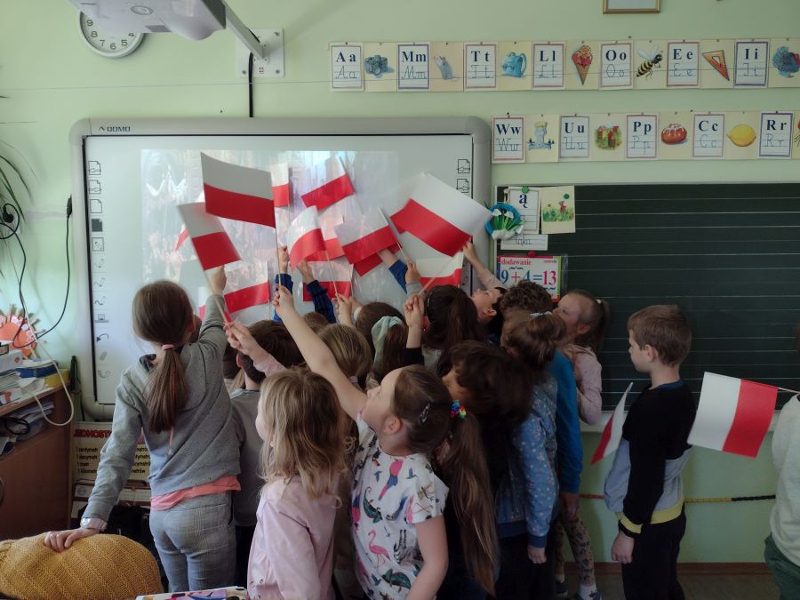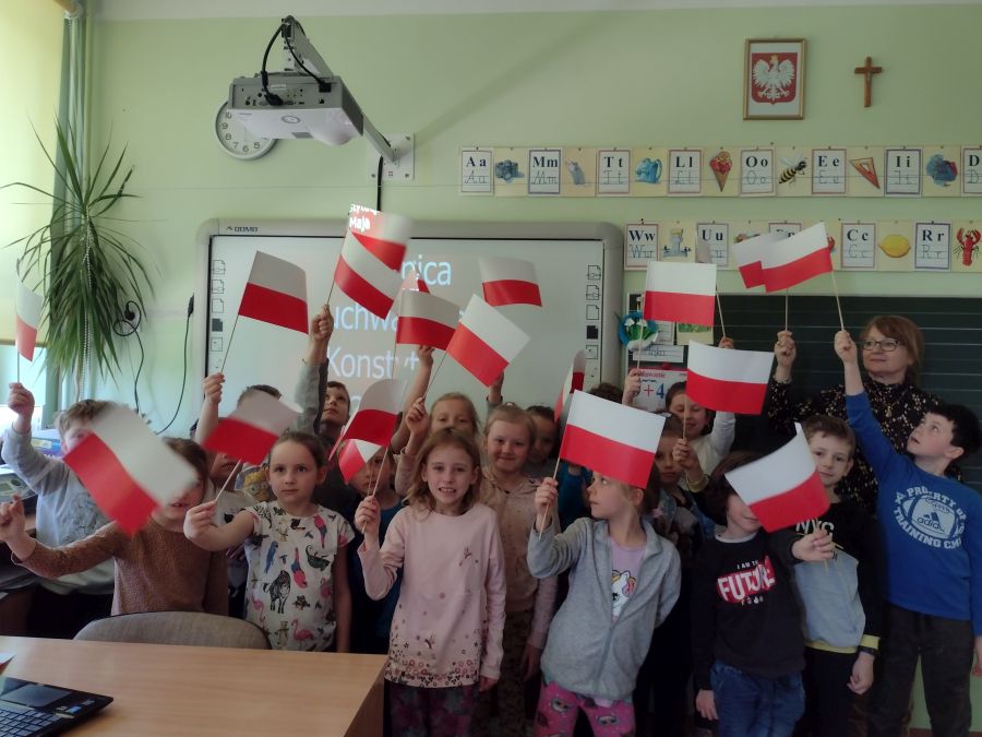 Pierwszaki świetnie znają już hymn. Teraz wychowawczyni Ewa Zasowska zorganizowała spotkanie z nauczycielką historii z okazji świat majowych. Rozmowa pomogła zrozumieć, dlaczego mamy aż trzy dni wolne? W kalendarzu przeczytaliśmy: 1 maja Święto Pracy, 2 maja – Dzień Flagi i Polonii, 3 Maja – Narodowe Święto Uchwalenia Konstytucji 3 Maja. Uczniowie potrafią opisać polską flagę. Wspaniale rozpoznają znaczenie barw narodowych, biel to czystość i szlachetność, a czerwień to odwaga i męstwo. Konstytucja jest najważniejszym dokumentem państwowym. 231 lat temu Polacy byli tak mądrym i odważnym narodem, że pierwsi w Europie uchwalili Ustawę Rządową. Dziś poprzez pracę i naukę możemy pokazać, że kochamy ojczyznę. Uczniowie klasy pierwszej potrafią wykonać flagę oraz uszanować święto państwowe.