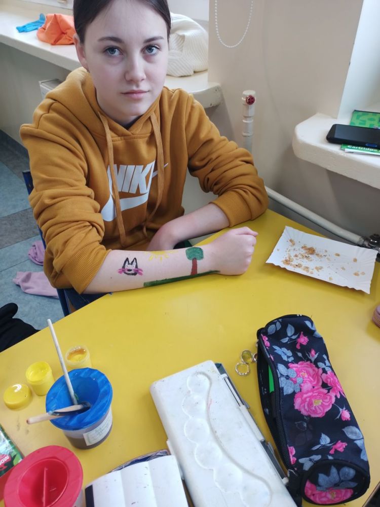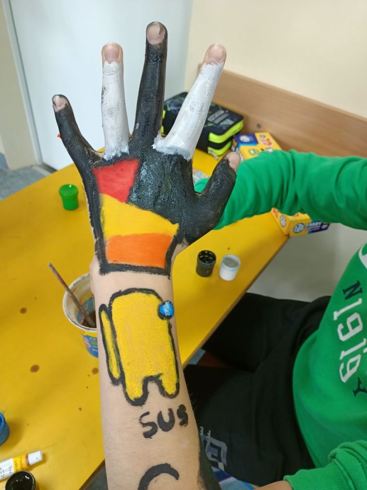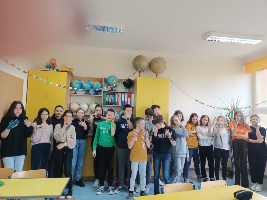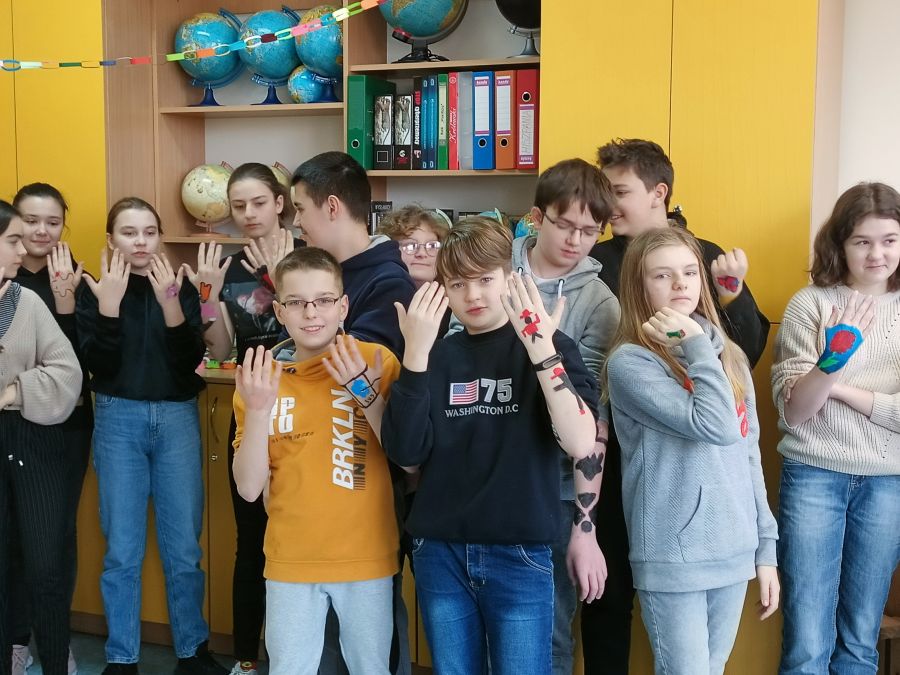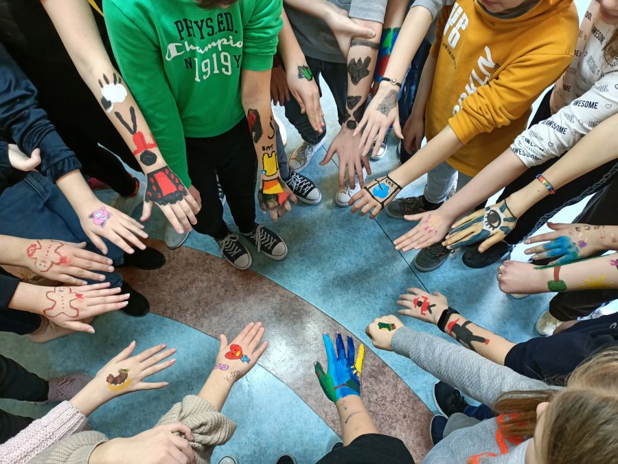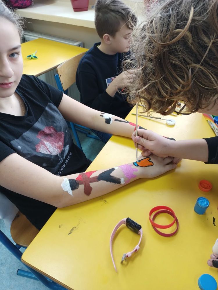 W obecnym nauczaniu proces działań plastycznych przebiega w pośpiechu, bez możliwości zachowania elementarnych wymogów procesu twórczego. Stąd wynika potrzeba prowadzenia zajęć w taki sposób, by uczniowie mieli możliwość rozwijania zainteresowań, zdolności manualnych i rozbudzania wyobraźni. Na nauczycielu bowiem, spoczywa odpowiedzialność za kreowanie wrażliwości, twórczej postawy i pomoc w odkrywaniu siebie. Dlatego zadaniem uczniów klasy VII na lekcji plastyki, było przedstawienie wybranego przez nauczyciela obrazu. Uczniowie zostali podzieleni na grupy, w grupie każda osoba odpowiedzialna była za wcielenie się w postać, która została dla niej wybrana. Stworzyli zatem "Żywy obraz" a efekty swoich prac prezentujemy na stronie szkoły. Kolejna twórcza praca to "Malowane dłonie". Było na pewno, kreatywnie, zabawnie i ciekawie. Zapraszamy do galerii.